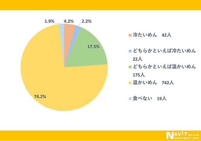 寒い時期に食べるのは「冷たいめん」か「温かいめん」かとの問いには、「温かいめん」742人と「どちらかといえば温かいめん」175人を合わせると917人。「温かいめん」が圧倒的に多いですね。