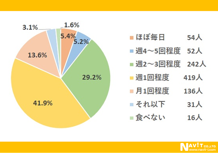 食べる頻度は「週1回程度」が最も多くて419人。次いで「週2~3回程度」が242人、「月1回程度」が136人。「ほぼ毎日」の人は54人いました。