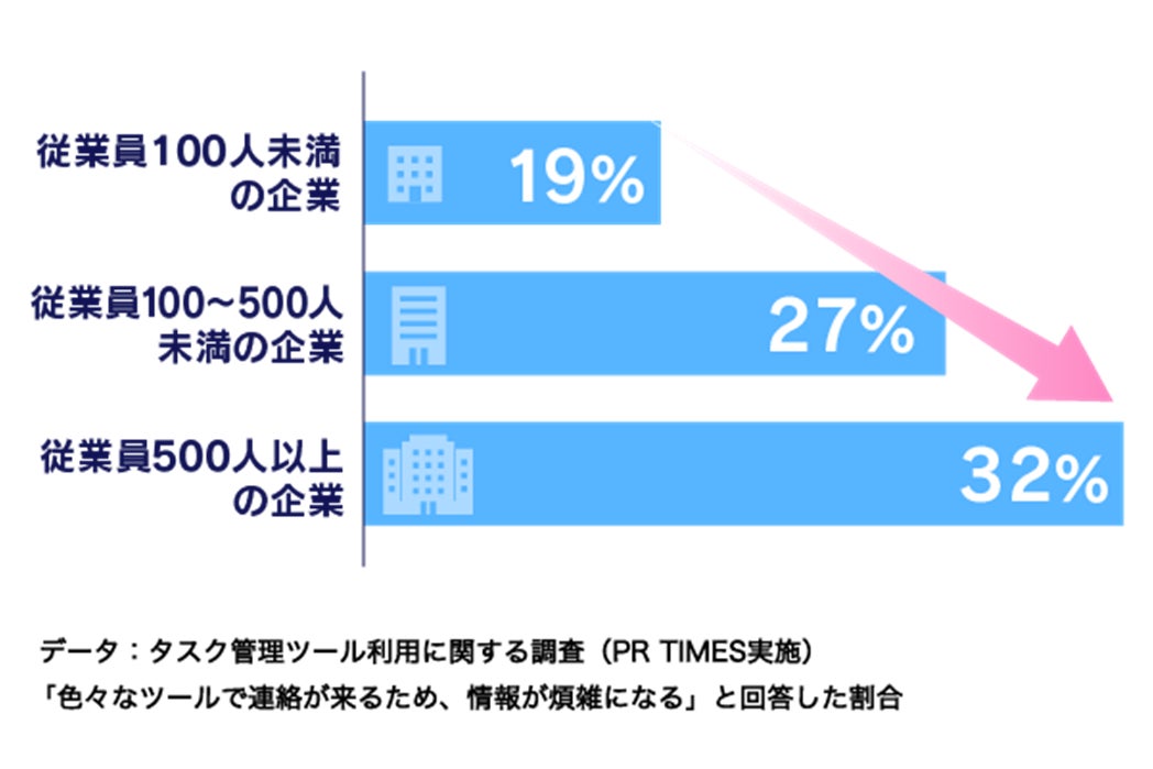 PR TIMESが2022年に実施したタスク管理ツール利用に関する調査(*3)では「あなたが感じるリモートワークの課題感をお答えください。」という質問に対して、約3割が「色々なツールで連絡が来るため、情報が煩雑になる」と回答しました。また、就業先の従業員規模が大きいほど、この選択肢を選ぶ割合は高くなる傾向が見られました。