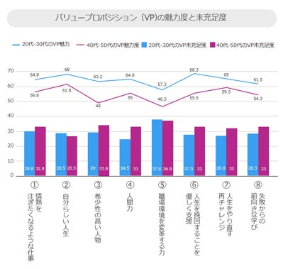 本調査は最初に「学び」に関するポジティブな体験価値から相対的に見た隠れた不満や未充足を抽出する定性調査を実施し、次に不満や未充足に対する共感度と、それらを満たすために提供するべき新しい価値提案への魅力度および現状感じている未充足度を定量調査で検証しています。