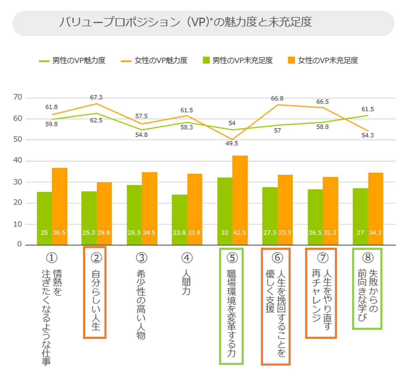 ②「自分らしい人生(男性62.5%、女性67.3%)」⑤「職場環境を変革する力(男性54%、女性49.5%)」⑥「人生を挽回することを優しく支援(男性57%、女性66.8%)」⑦「人生をやり直す再チャレンジ(男性58.8%、女性66.5%)」⑧「失敗からの前向きな学び(男性61.5%、女性54.3%)