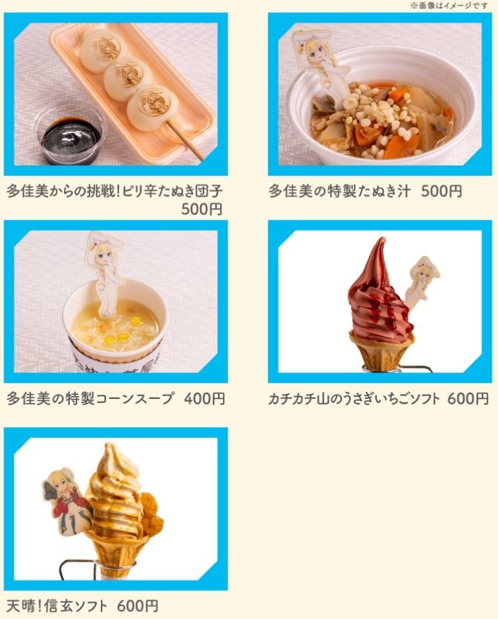 2月23日(水祝)以降、河口湖駅や富士山パノラマロープウェイ、河口湖遊覧船など、エリア内の各所にフォトスポットが登場する他、各施設のアナウンスも人気声優・大西沙織さんがキャラクターの声を努める『河口湖多佳美』バージョンに切り替わります。また、グッズやノベルティは、「兎」や「車掌」、「武田信玄」など各施設にちなんだオリジナルデザインでご用意しており、それぞれの場所でしか手に入れることができないため、プレミア感満載です。さらに、『河口湖多佳美』の焼き色が付いたお団子や、『河口湖多佳美』パッケージのフジヤマクッキーなど、味も見た目も楽しめるオリジナルフードも登場。周遊バスや富士山パノラマロープウェイ、河口湖遊覧船をお得に満喫できるオリジナルノベルティ付きの「周遊チケット」もご用意しております。
