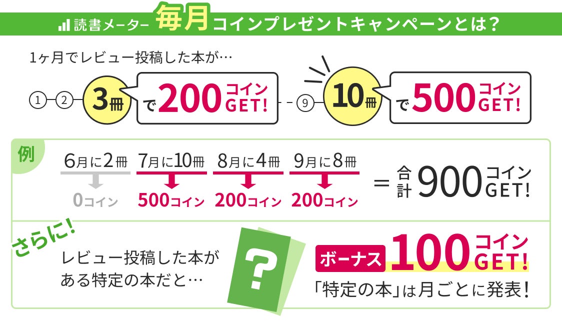 2024年6月~9月で毎月実施。1カ月で3件以上の感想・レビューの投稿で200コイン、10件以上で500コインをプレゼントします。