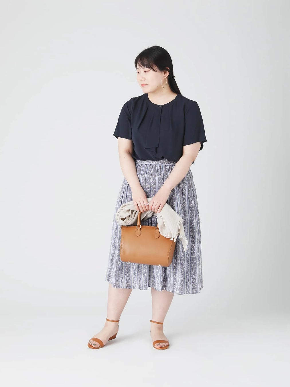プリントスカートを合わせたきれいめカジュアルスタイル。上下を青みのトーンでまとめることで、涼やかな着こなしに仕上げました。シンプルながら、袖やスカートの揺れるフレアラインが印象的で女性らしい雰囲気に。スカートはタックの上部を中縫いしたデザインで、ウエスト周りをすっきり見せてくれます。[身長:157cm]