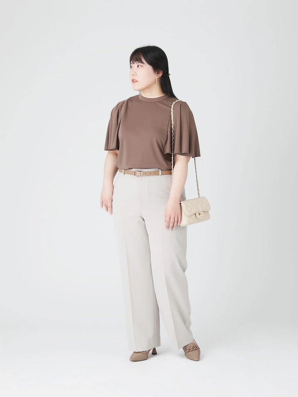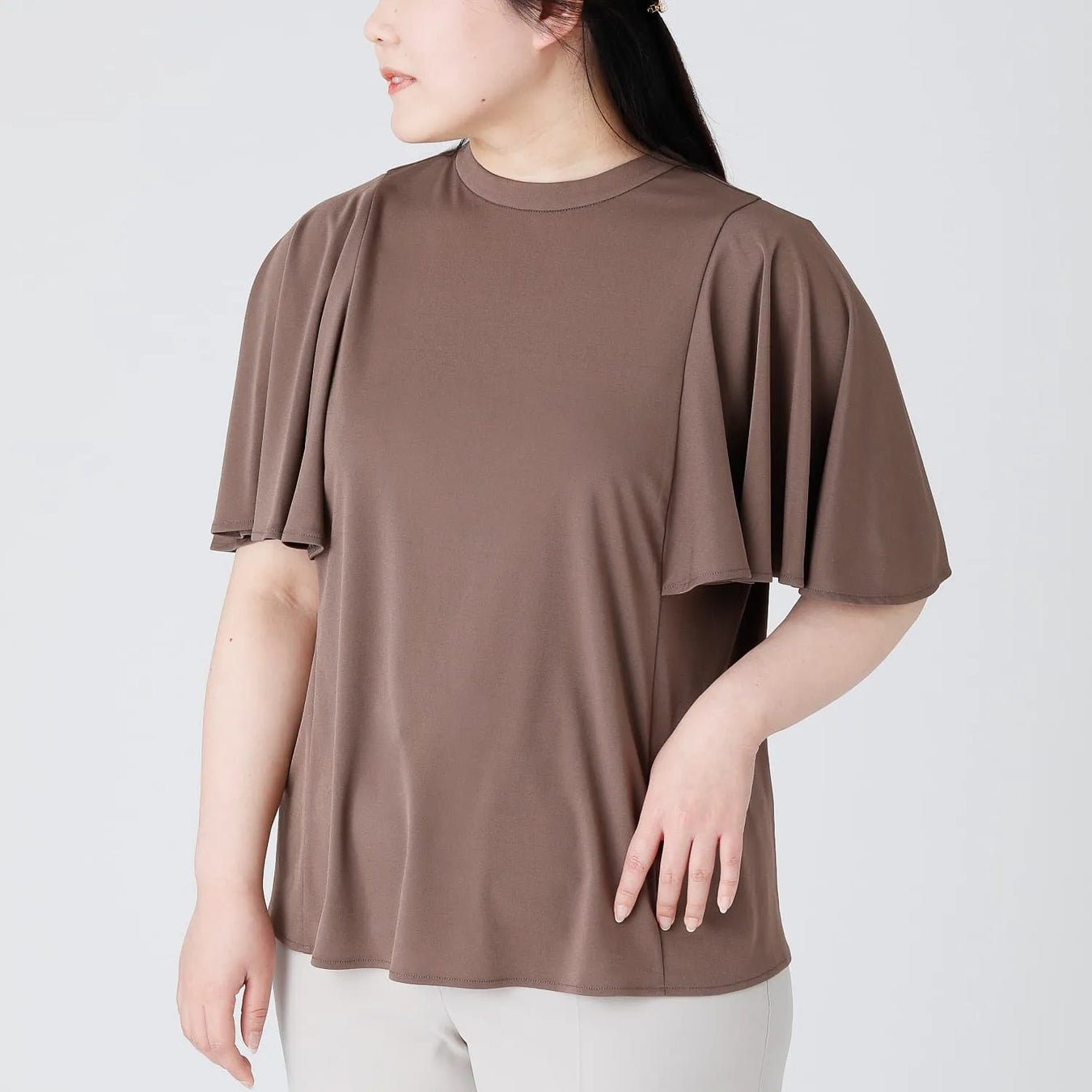 フレア袖が二の腕を自然にカバーしてくれるプルオーバーブラウス。襟元のタック&フリルが顔映りを華やかに見せつつ、控えめなボリュームで上品かつすっきりとした印象です。シンプルで幅広い着こなしに取り入れやすく、ジャケットのインナーとしてもおすすめ。着用サイズ:L13号