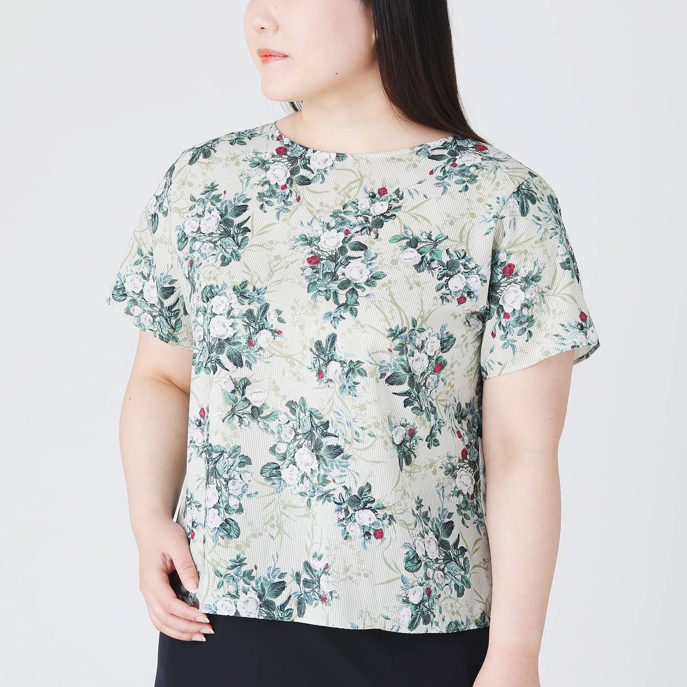 レトロな趣きのあるフラワーブーケとストライプを重ねた、新鮮なプリントが目を惹く半袖ブラウス。ドルマンスリーブを変形させたような緩やかな袖のラインが、二の腕を自然にカバーしてくれます。ややボートネック気味の浅い襟開きが上品な印象で、デコルテが開きすぎずすっきりお召しいただけます。着用サイズ:L13号