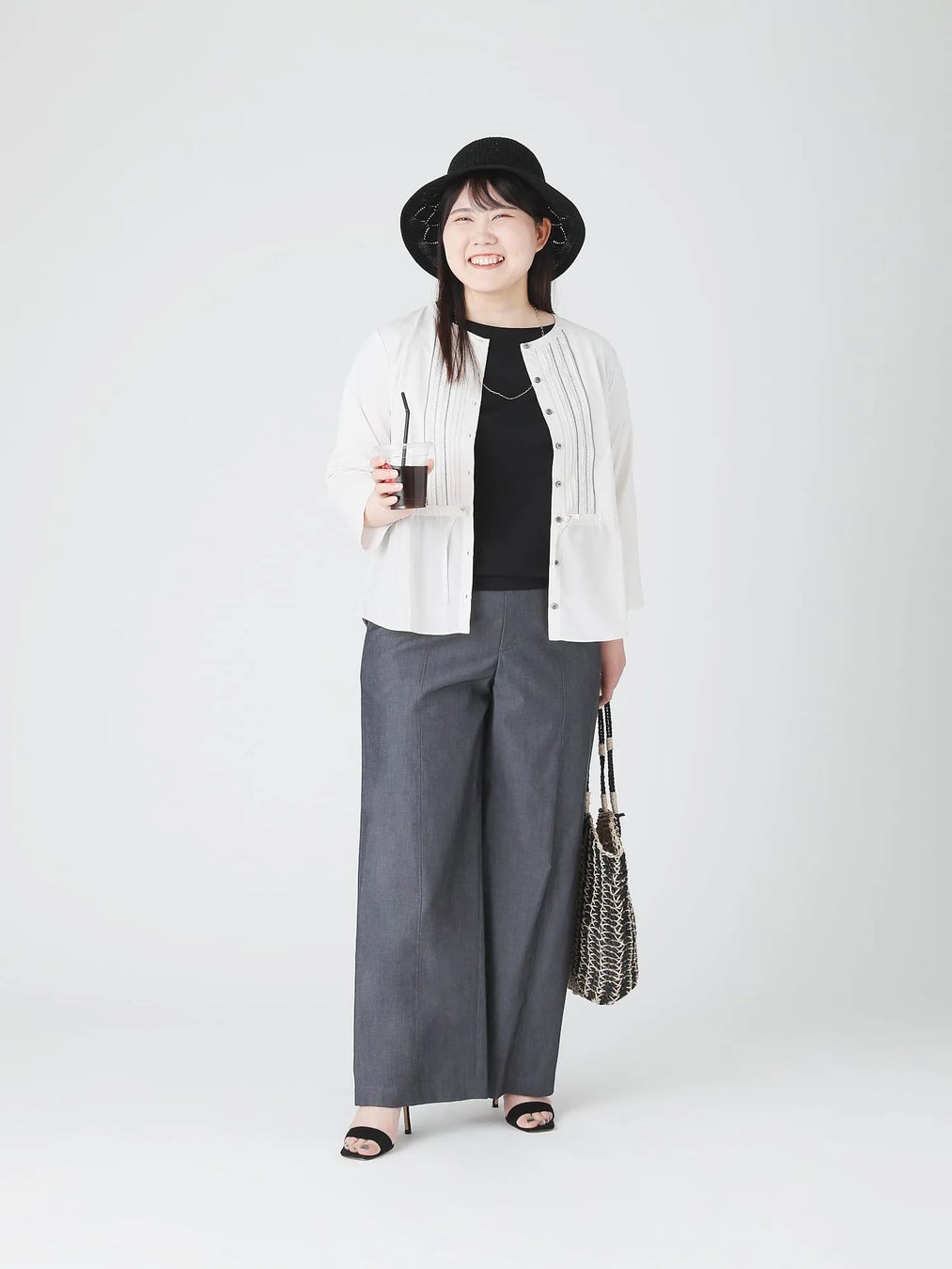 夏のお出掛けスタイルは、カットソーをさらりと羽織ってリラクシーに。太陽光遮熱・UVカット性のあるTシャツをインすれば、日差しが強い日も安心です。ブラックを効かせたシックな配色に、デニムのワイドパンツでカジュアルなムードをプラス。幅が広いブリムのハットは、日除けだけでなくすっきり見えにも効果的です。