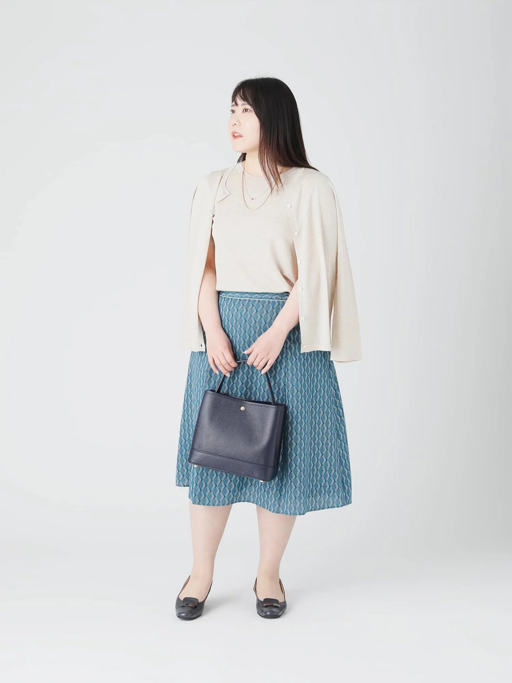 同素材のカーディガンを肩掛けしたアンサンブルスタイル。華奢なチェーンの2連ネックレスは、シンプルなニットを華やかに彩り、さりげなく目線を上げてくれます。ボトムは、ホワイトの配色が涼しげなプリントスカートをチョイス。ダイヤのようなモチーフが繋がったプリントは、縦のラインを強調しすっきりとした印象に導きます。