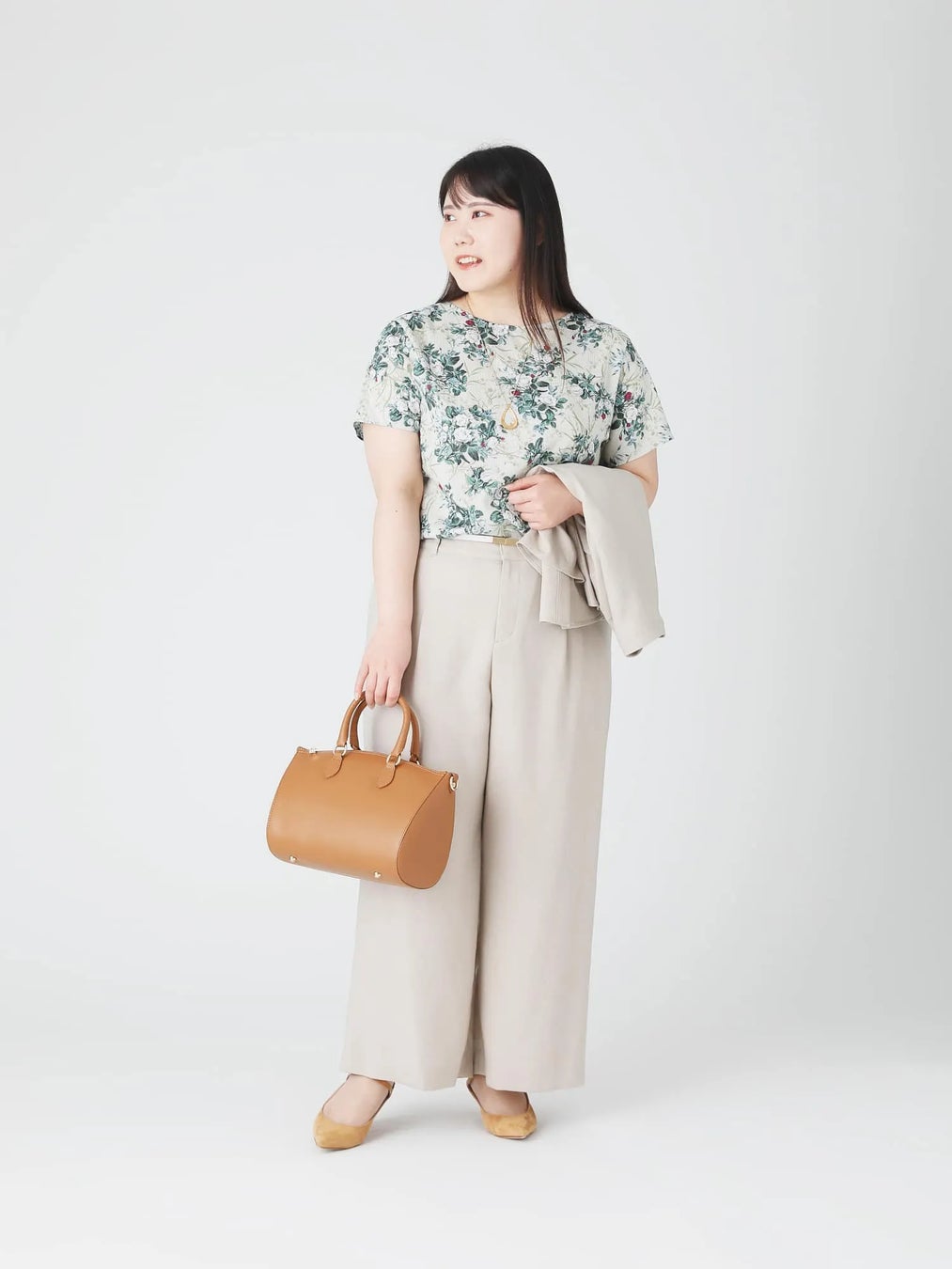 麻調素材のガウチョパンツを合わせて、見た目も着心地も爽やかな着こなしに。ゆとりのあるシルエットでレッグラインをカバーしつつ、細めのベルトやパンプスでカジュアル感を抑えました。ナチュラルな面持ちでありながらツヤも併せ持つパンツは、ブラウスの華やかな雰囲気と相性が良く上品にまとまります。ブラウスは1枚着ではもちろん、セットアップのインナーとしても存在感を発揮してくれます。[身長:157cm]