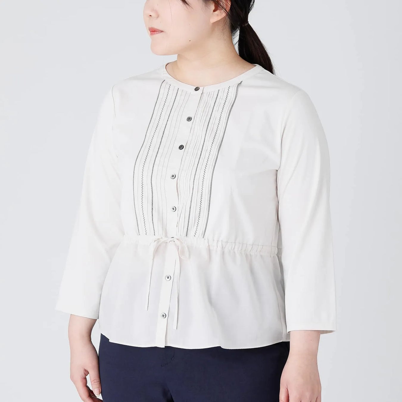 吸水速乾素材を使用した、真夏も快適に過ごせる7分袖カットソー。長めの着丈がお腹周りやウエストをカバーし、ドローストリングでシルエット変化も楽しめます。1枚着ではもちろん、釦を開ければ羽織りにもなるマルチなアイテムです。着用サイズ:L13号