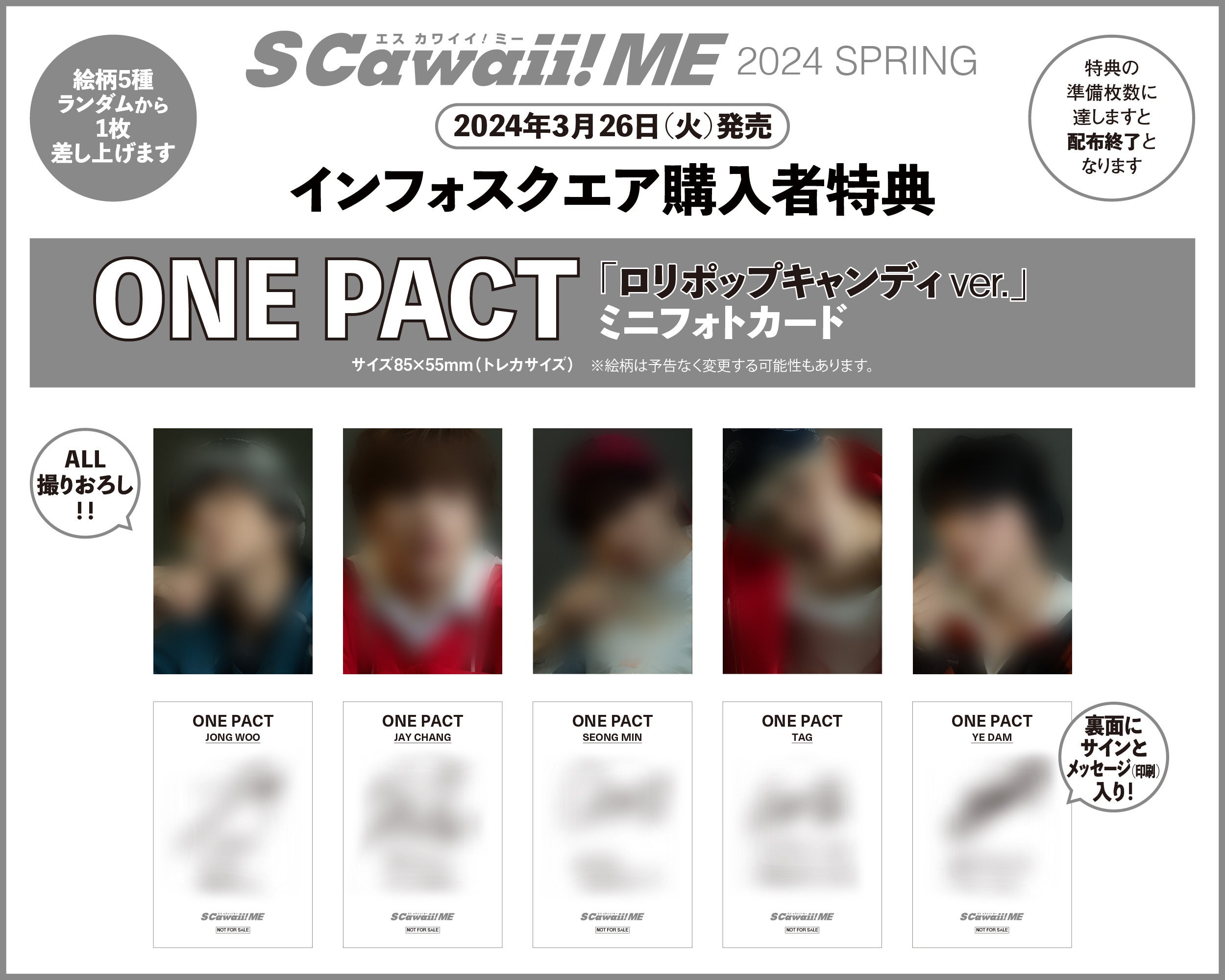 下記URLから『S Cawaii! ME 2024 SPRING』をお求めいただくと、ONE PACTのミニフォトカードを5種からランダムで1枚差し上げます。