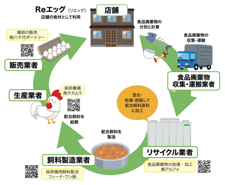 本取り組みでは関東の一部店舗で排出された調理くずや食べ残しなどの食品廃棄物を資源として、再生利用事業者である株式会社アルフォ(本社:東京都港区)の飼料化センターで製造した飼料を、フィード・ワン株式会社(本社:神奈川県横浜市)で配合飼料にし、農業生産者である株式会社タカムラ(本社:富山県黒部市)の養鶏場で給餌し、生産された鶏卵を株式会社八千代ポートリー(本社:神奈川県横浜市)を通し、店舗に納品して再びお客様に提供しています。