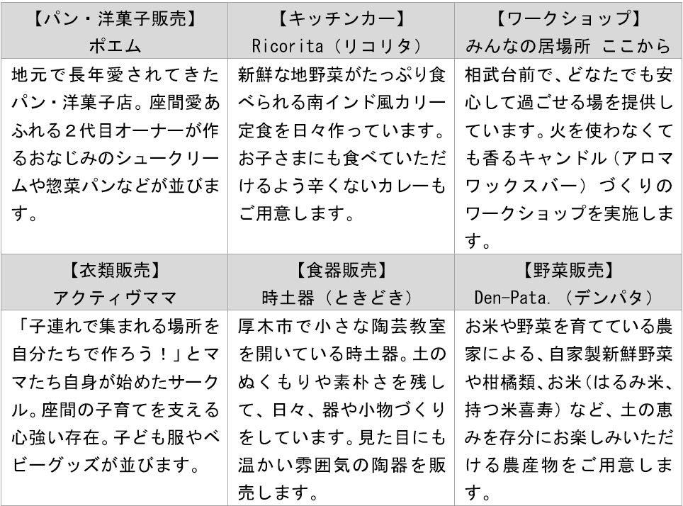 節目となる今回は、引き続き座間エリアをはじめ小田急沿線を中心に、過去最高の22コンテンツが集まります。座間エリアからは、地元で長く愛されてきた洋菓子店のシュークリームや陶芸体験などが、エリア外からも収穫したての新鮮野菜販売やハロウィーンをモチーフにした髪飾りなどのワークショップをお楽しみいただけます。