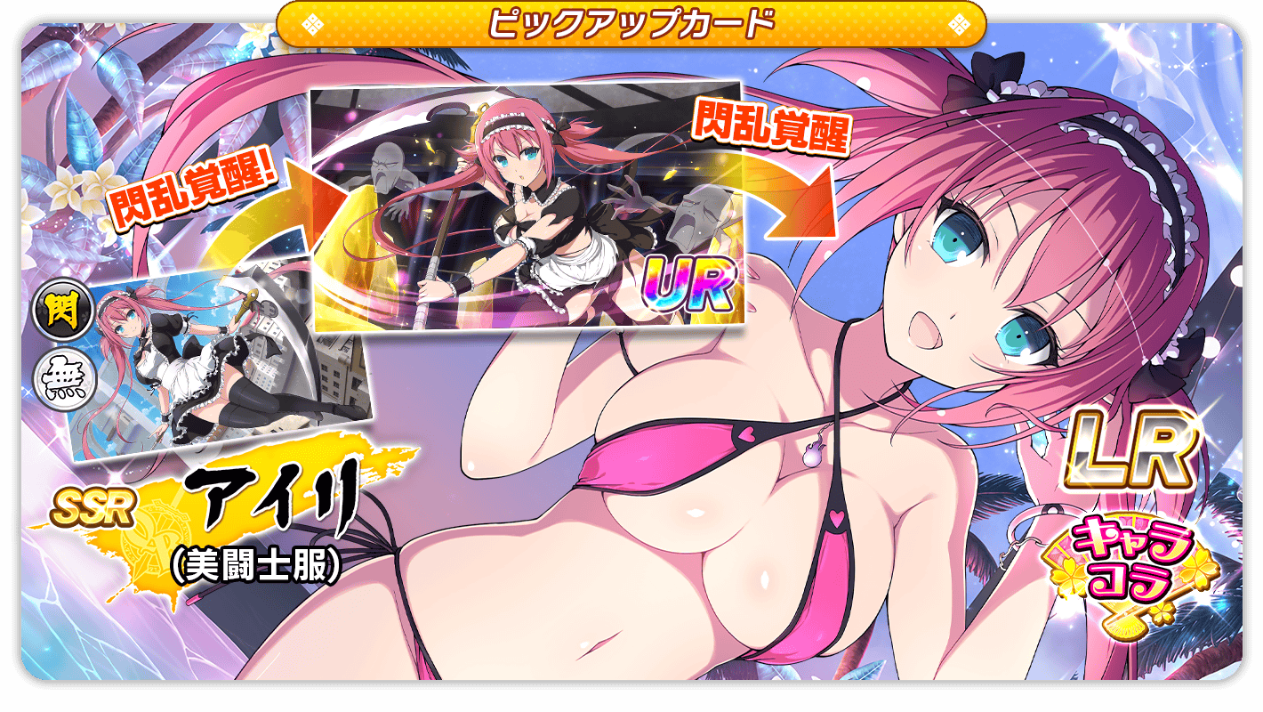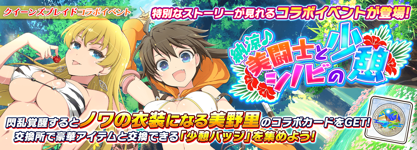 「アイリ」「レイナ」「エリナ」の新カードが登場し、「アイリ」はLRまで覚醒!過去に登場したクイーンズブレイドコラボカード全てが復刻登場!「ノワ」姿の「美野里」が手に入るイベントも同時開催中!