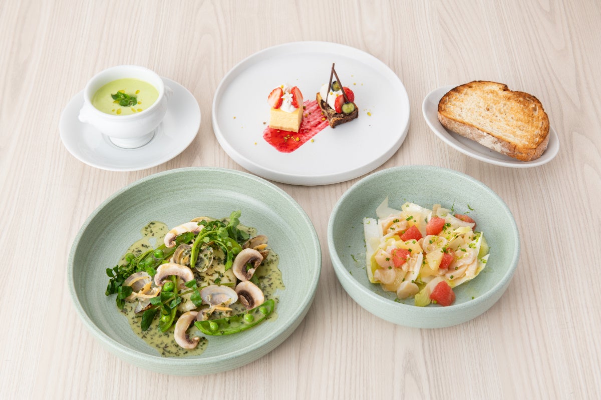 ブラータチーズのカプレーゼ/ホタテとアンディーブのサラダ/そら豆の冷製スープ