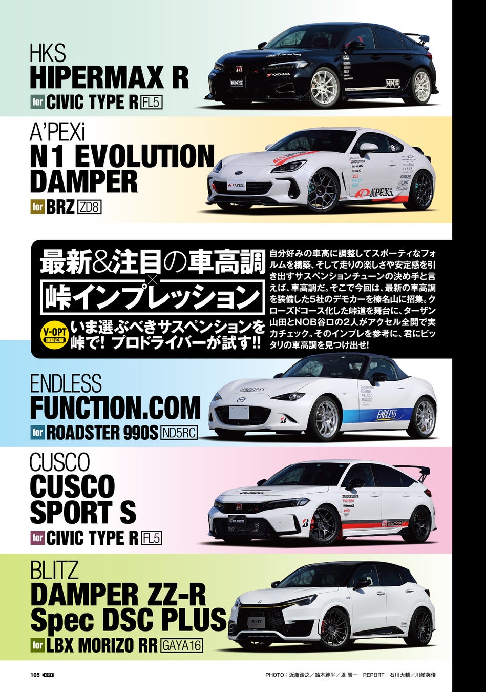 第二特集ではサスペンションパーツメーカーが誇る最新の車高調をピックアップ。FL5シビックタイプR、NDロードスター、ZD8・BRZ、LBX MORIZO RRといった現行モデルに装着し、峠道をプロドライバーによる全力走行とそのインプレッションで、それぞれの魅力を紹介している。