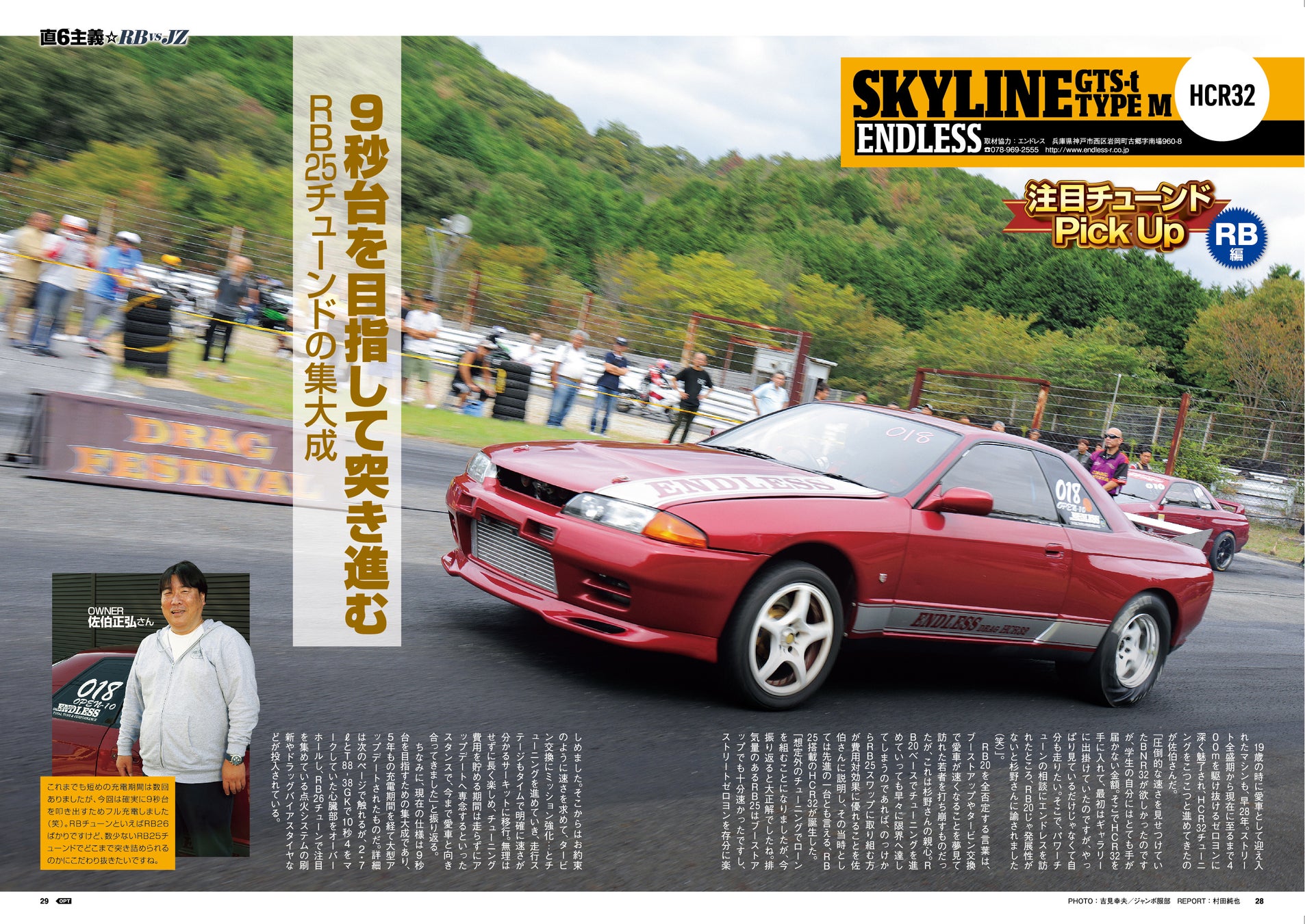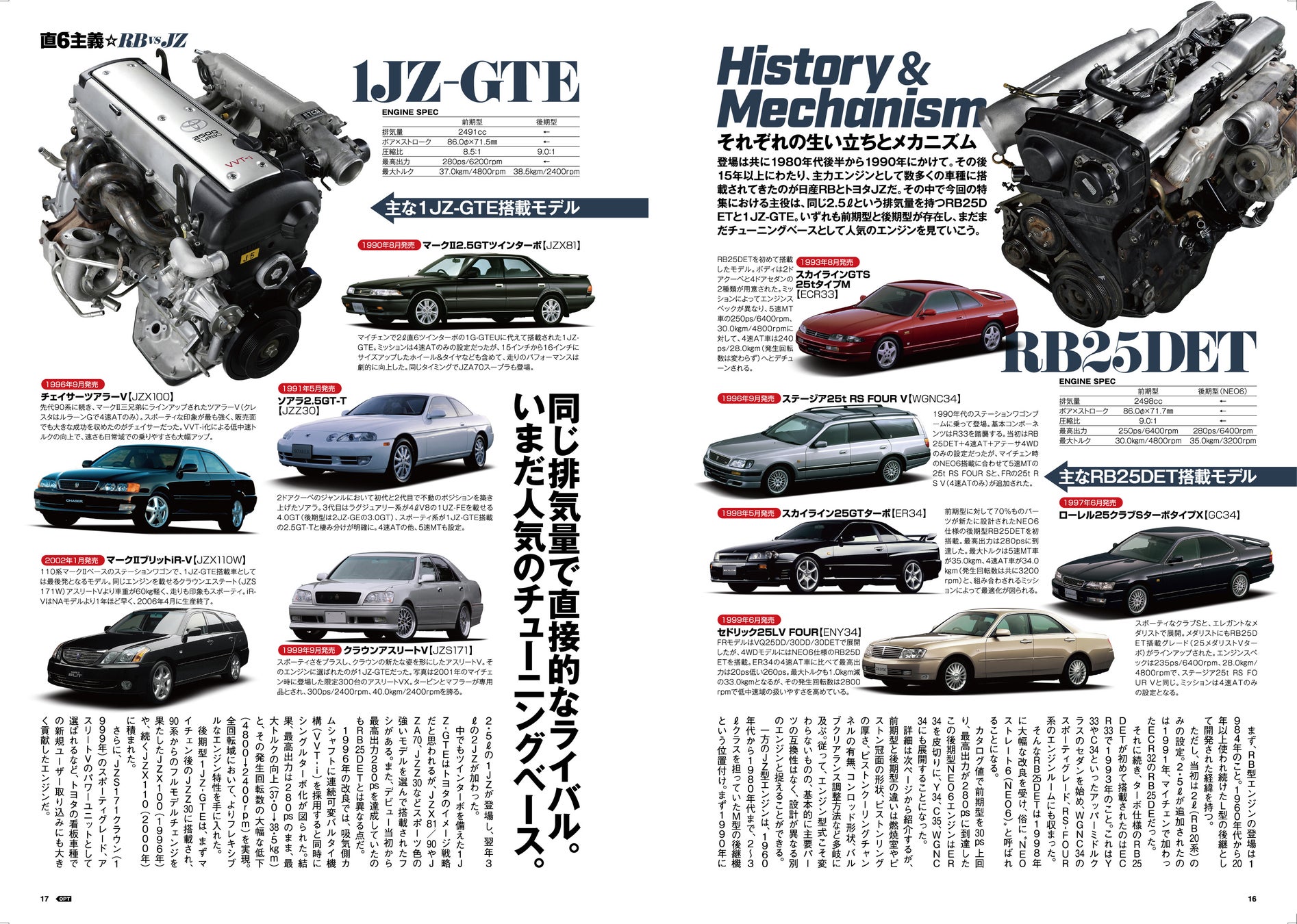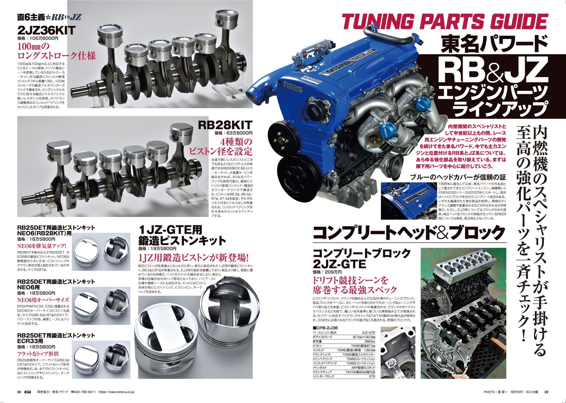 チューニングパーツが豊富に揃い、しかも現在も最新パーツが開発され続けているRBとJZエンジン。中でも、この2つのエンジンに注力している東名パワードを総力取材。その製品の魅力に迫っている。また、GCGの最新ターボキット情報を始め、各社のチューニングパーツカタログも要チェックだ。