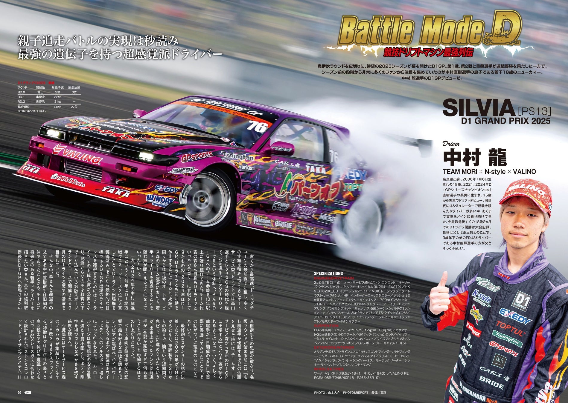 競技ドリフトのトップランカーとその愛機のスペックを紹介する大好評連載『バトルモードD』。今月は2025年シーズンからD1GPにS13シルビアで参戦する、中村 龍選手をフィーチャー。富士スピードウェイのエキシビションマッチから好成績を収め、その実力を持って評価を高めている注目の中村 龍選手に迫る。