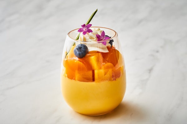 ココナッツクリームが入った、とろける口当たりで人気のマンゴープリンです。トッピングには、アップルマンゴーとライムのクリームを飾りました。果肉、ソース、プリンでマンゴーを存分にご堪能いただけます。