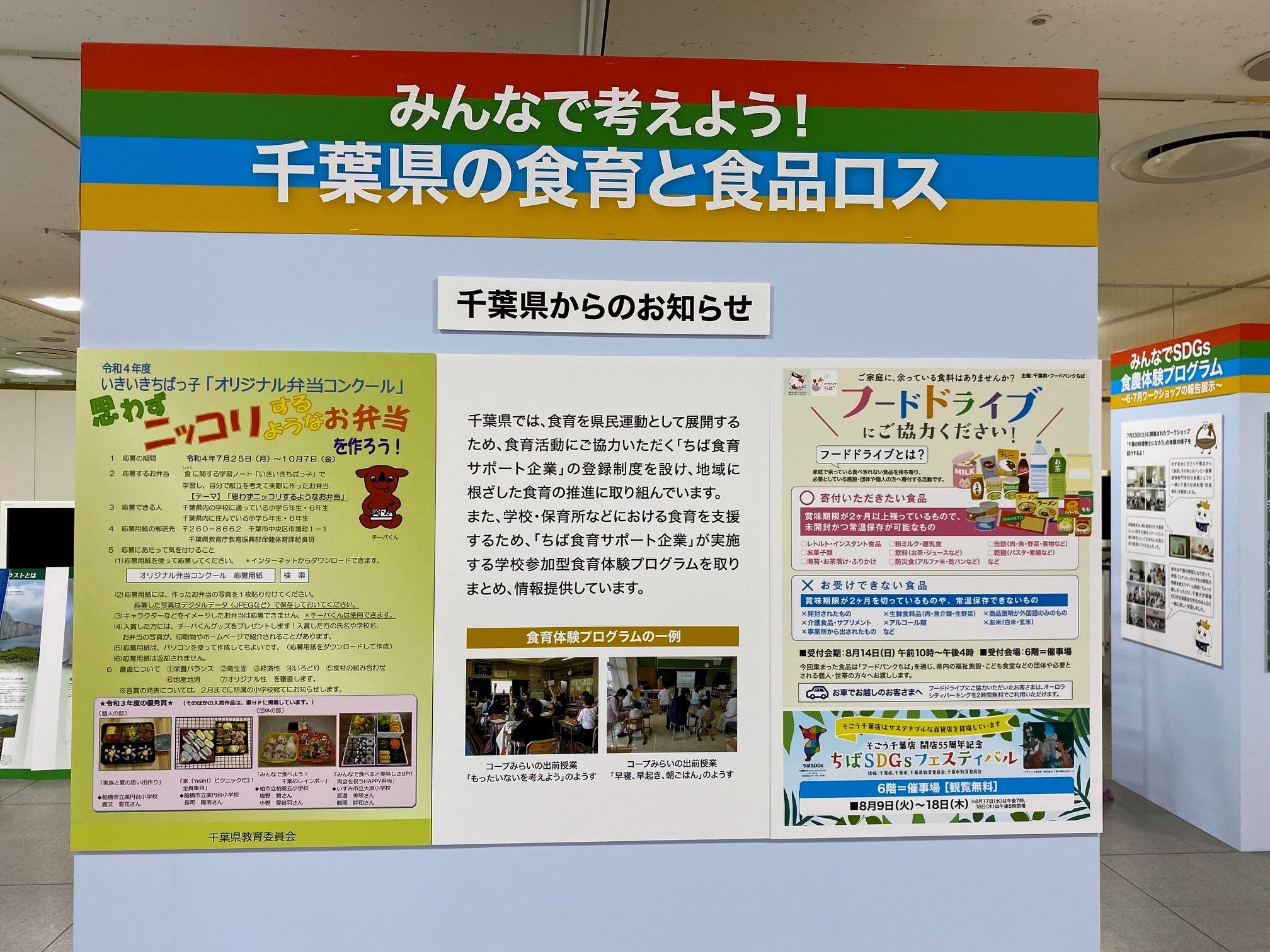 千葉県の「ちば食べきりエコスタイル」の推進活動、バランスの良い食生活についてパネルで展示。