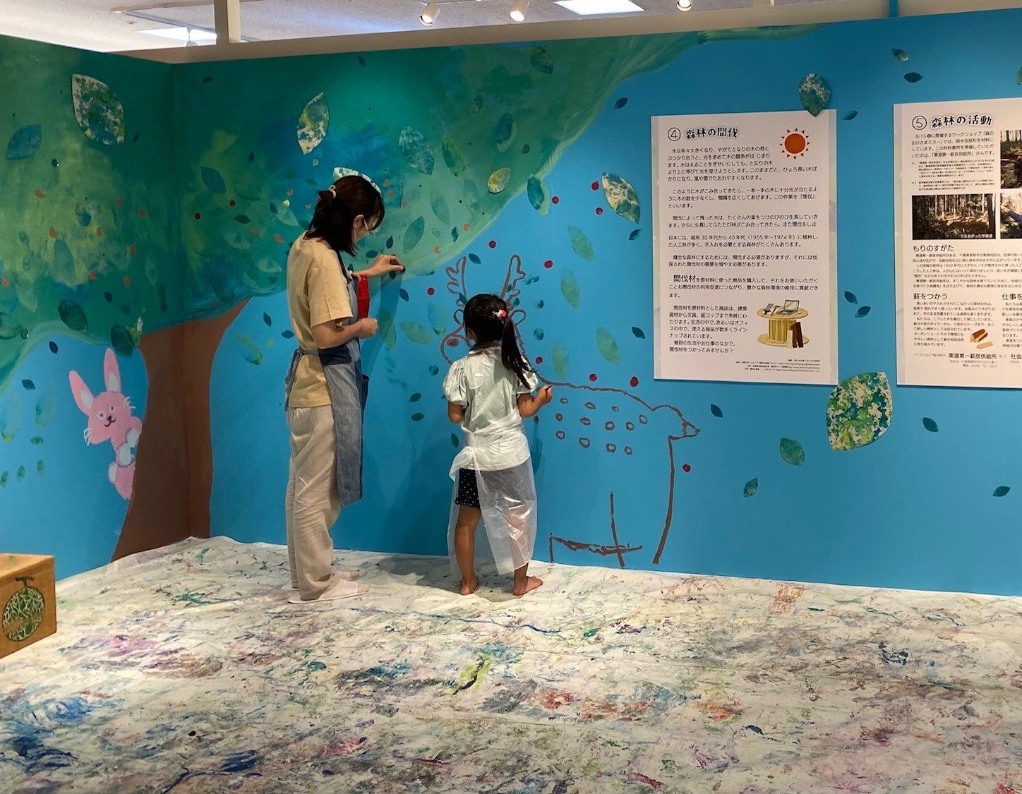 一宮町のアート教室・たまあーと創作工房による木々や生き物をみんなで描くライブペインティングを8月9日(火)に、倒木伐採杉を材料にしたワークショップを8月13日(土)に開催。森林と人の循環を知ることで環境保護を学べるパネルを展示。