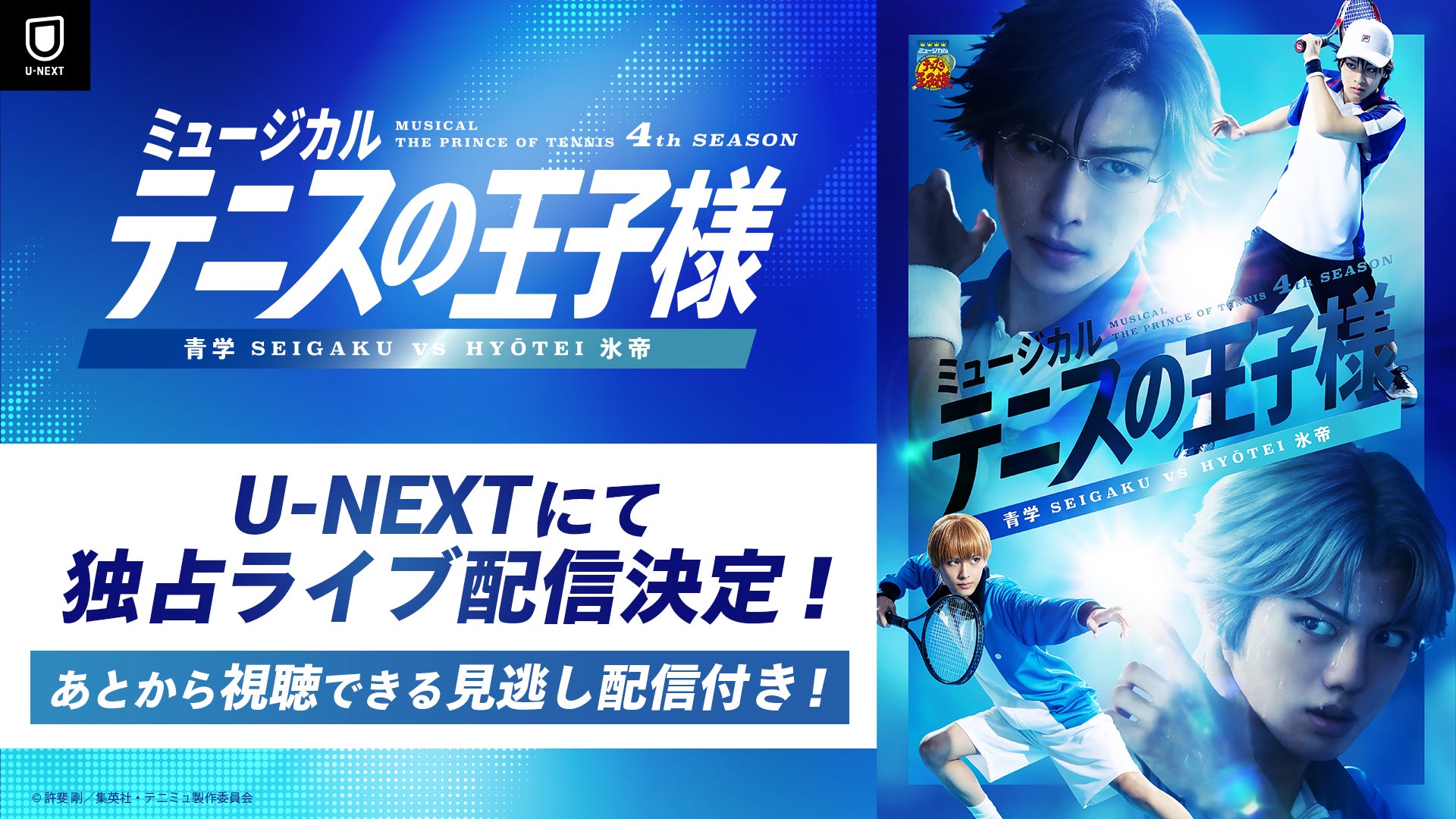 このたびU-NEXTでは、「ミュージカル『テニスの王子様』4thシーズン 青学(せいがく)vs氷帝」を独占でライブ配信いたします。東京公演 初日、東京凱旋公演 大千秋楽に加え、「青学(せいがく)」「氷帝」それぞれの学校にフィーチャーしたスイッチング映像が視聴できるライブ配信も実施予定です。いずれも公演終了後も楽しめる見逃し配信つきで、後日アーカイブ配信も実施いたします。ぜひお楽しみください。