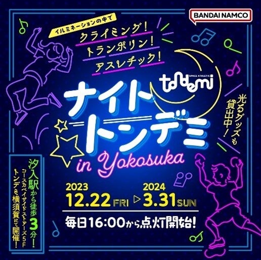 株式会社バンダイナムコアミューズメントは、屋内アスレチック施設「トンデミ横須賀」にて、2023年12月22日(金)~2024年3月31日(日)の期間限定で、毎日16時からムービングライトやネオン照明など、さまざまな光が点灯する『ナイトトンデミ』を開催します。トランポリンやクライミング、巨大スライダーなど友だちと一緒に盛り上がれるアクティビティを楽しみながら、光に包まれる非日常体験を体験しましょう!光るメガネや光るなわとびなど、光るアイテムも多数用意します。みんなで動画や写真を撮って、寒い冬にも負けずに素敵な思い出を作ろう!