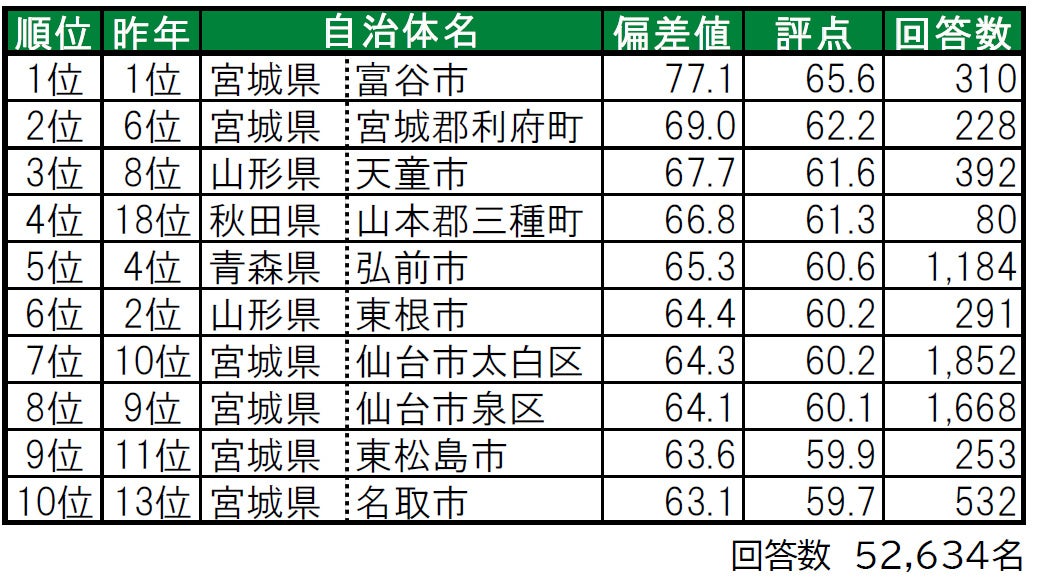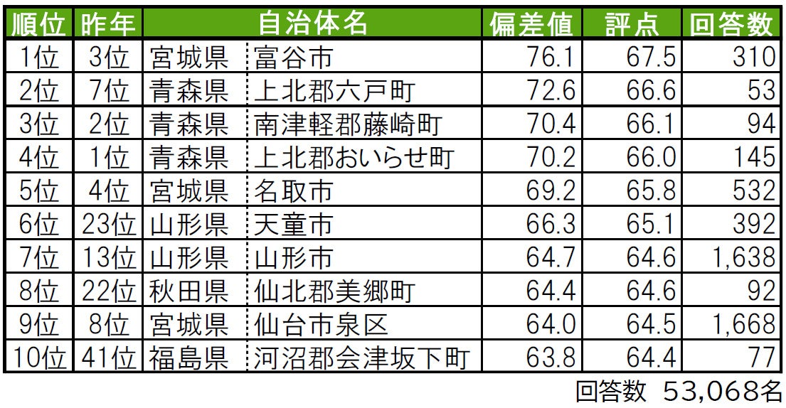 1位は4年連続で宮城県富谷市で、唯一偏差値70台の高い評価を得ています。2位は宮城県宮城郡利府町(昨年6位)、3位は山形県天童市(昨年8位)で、いずれも昨年から順位を上げました。4位は秋田県山本郡三種町(みたねちょう)で、昨年18位から順位を上げており、トップ10内で唯一、秋田県の自治体でランクインしています。