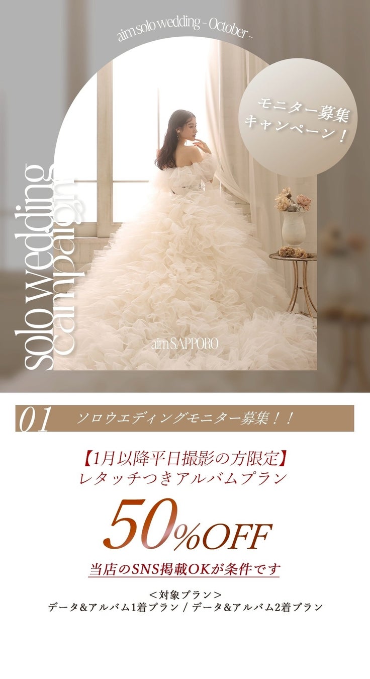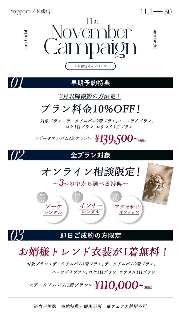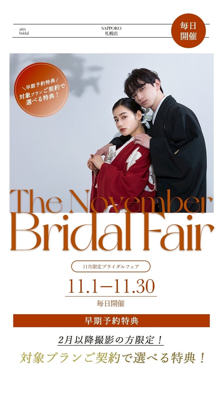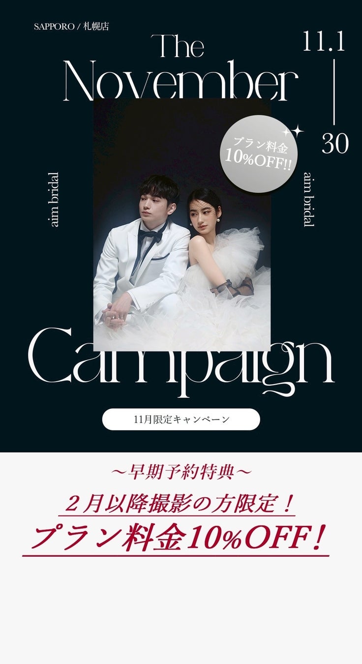 北海道札幌市のウエディングフォトスタジオ、aim札幌店の11月のキャンペーン、フェア情報をお届けいたします!フォトウェディングの際のお得情報やソロウェディングキャンペーンもご紹介をしております。