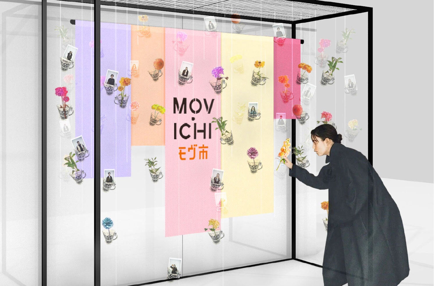 小さなミニブーケが吊るされた、可憐なフォトブースが登場。写真を撮影してブーケを一つ連れ帰る代わりに、自分の写真をその場所に残していくという試みです。会場を彩っていた花々が来場者の手によって記憶へと変わり、代わりにブースが人々の笑顔で満たされていく——。時間とともに完成していく参加型インスタレーションです。