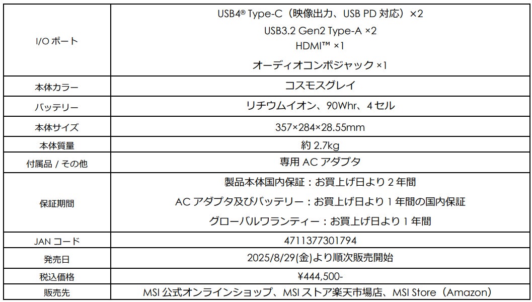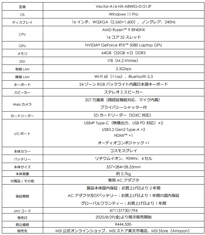 ・Vector A16 HX A8W シリーズ製品ページ:https://jp.msi.com/Laptop/Vector-A16-HX-A8WX