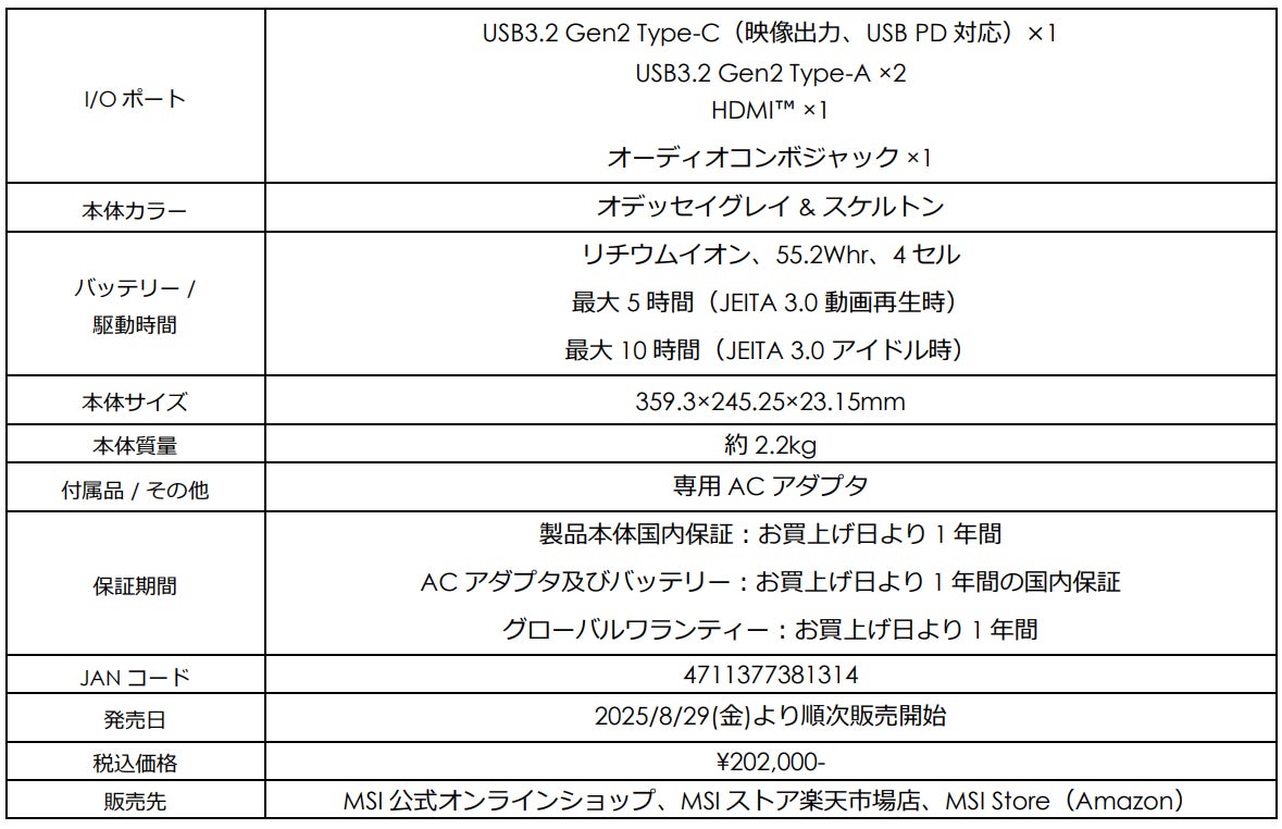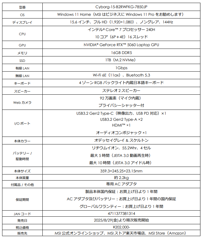 ・Cyborg 15 B2RW シリーズ製品ページ:https://jp.msi.com/Laptop/Cyborg-15-B2RWX