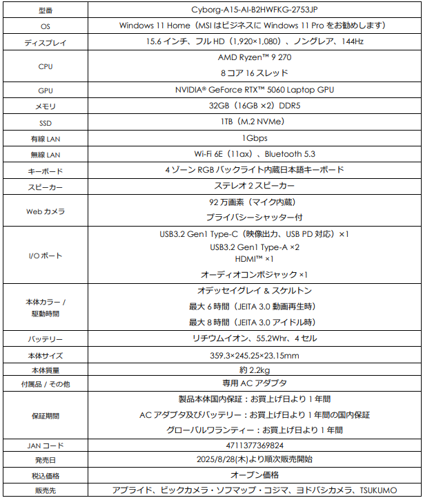 ・Cyborg A15 AI B2HW シリーズ製品ページ:https://jp.msi.com/Laptop/Cyborg-A15-B2HWX