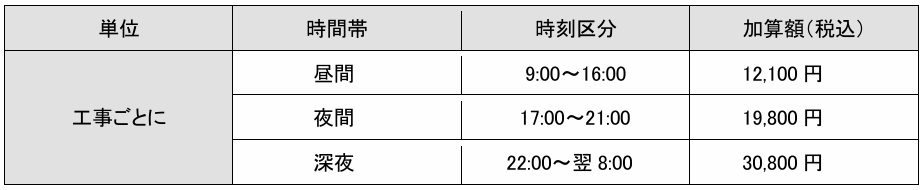 通常の工事費に追加して、工事ごとに下の金額を加算した料金を適用します。