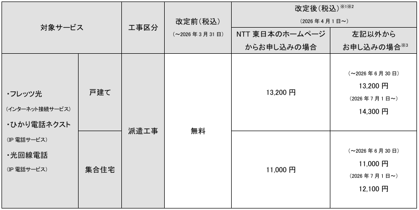〔例:フレッツ光などの解約時に派遣工事を行った際の標準的な工事費〕 ・ 戸建て向け : 【改定前】0円 → 【改定後】13,200円※3(税込) ・ 集合住宅向け : 【改定前】0円 → 【改定後】11,000円※3(税込) 〔例:無派遣工事の場合〕 ・改定後においても解約時の工事費は発生いたしません。 工事費の内訳は【別紙2】をご確認ください。 |