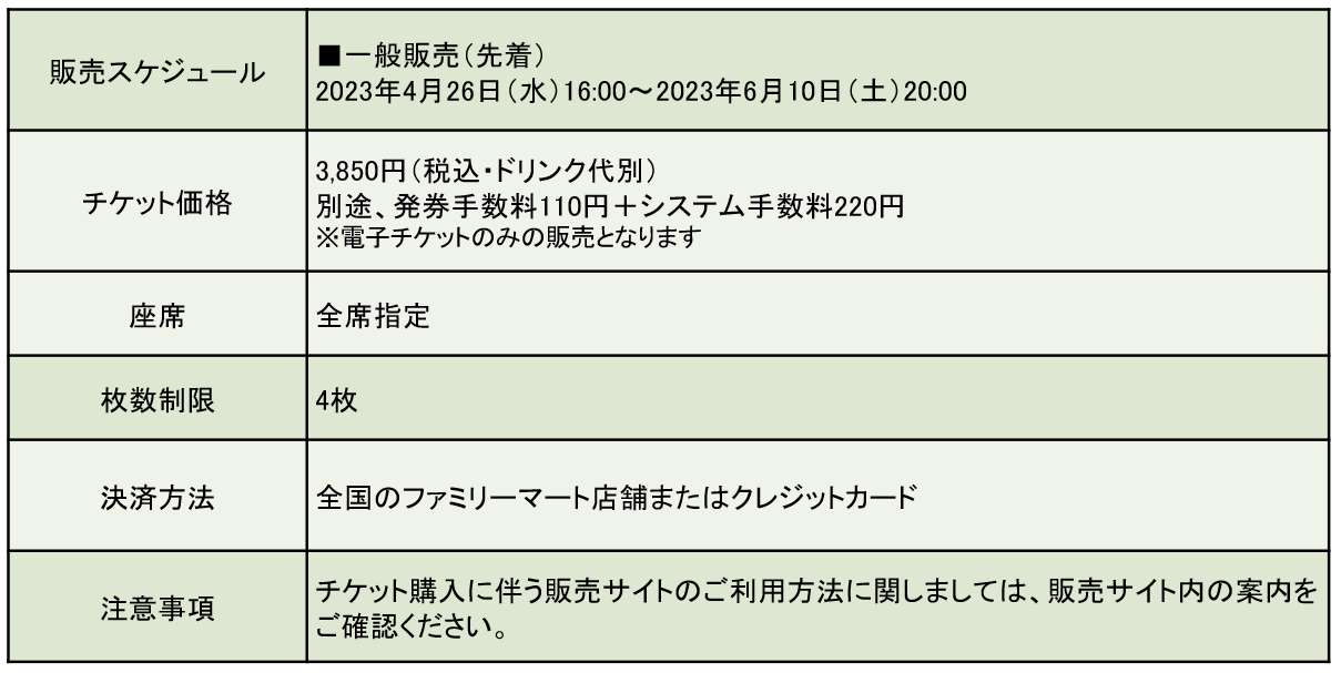 チケット価格 | 3,850円(税込・ドリンク代別) 別途、発券手数料110円+システム手数料220円 ※電子チケットのみの販売となります |