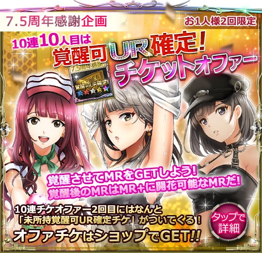 期間限定で7.5周年感謝福袋をご用意。「10連10人目覚醒可UR確定オファーチケット」やMR&UR覚醒素材、育成素材が手に入るお得なセットです。