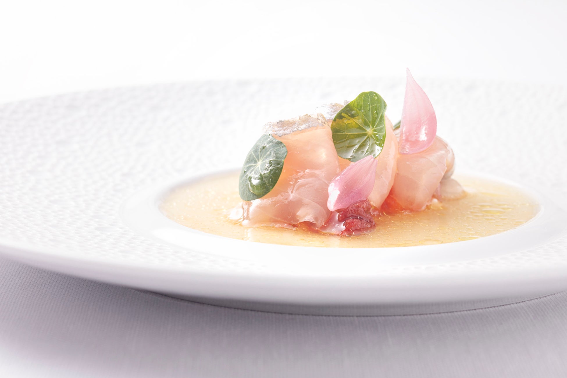 コースは、独特で豊かな味わいのシマアジ、パプリカ、ドライトマトと松の実のピューレで彩られた≪シマアジのカルパッチョ≫で、夢のような地中海の夏を連想させるディッシュでスタートします。