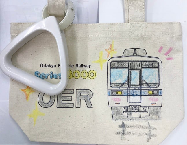 通勤車両8000形がプリントされたトートバッグにクレヨンで 色付けし、実際の車両で使用されていた「つり革」をアクセントに取り付けることで、世界に一つだけのオリジナルトートバッグを制作いただけるワークショップです。