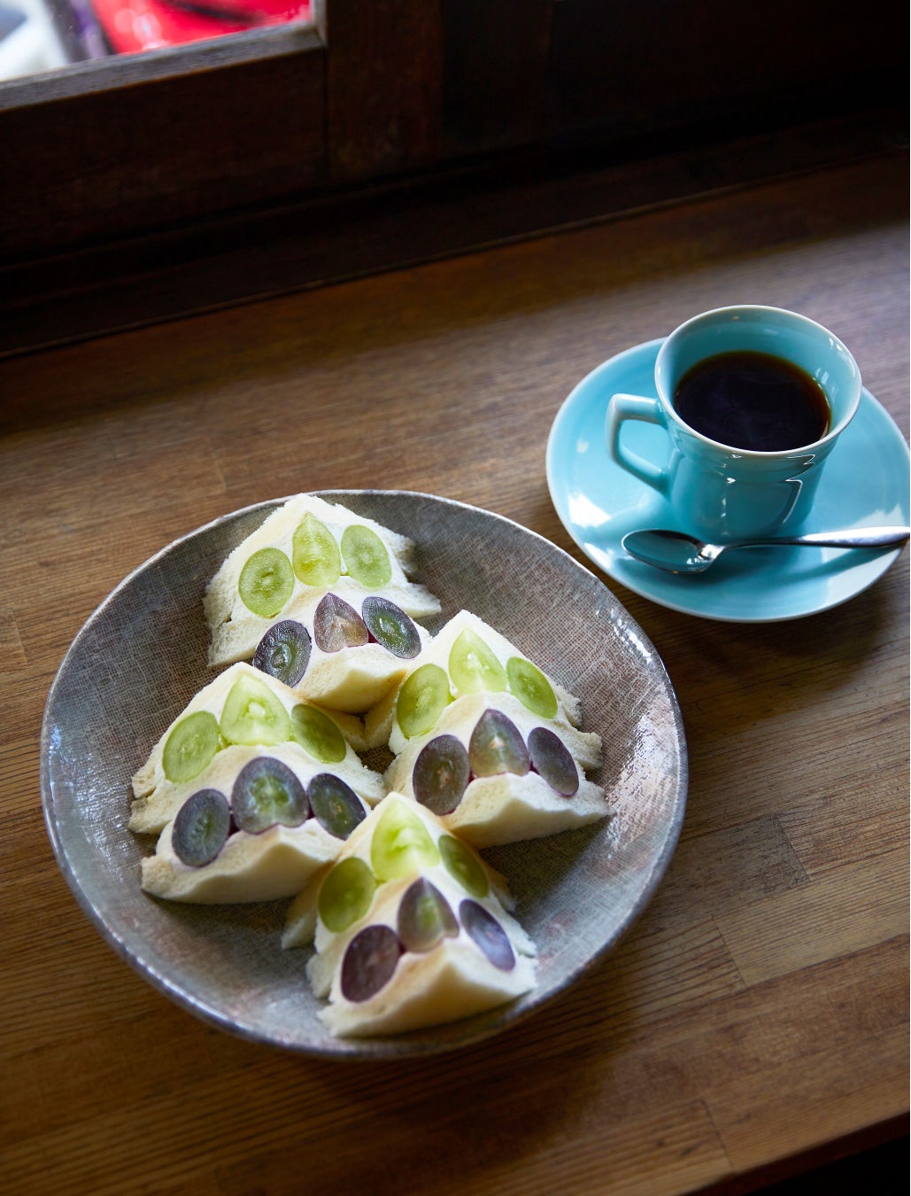 祖父・父・兄が清水焼の作家という、マスターの市川陽介さんは、祖父の工房だった築200年の町屋を改造し て2015年にこちらをオープン。もともと台所だった14mの吹き抜けの空間には、大きな焙煎機があり、店 内には豆のいい香りが広がります。お店で出すドリンクは父と兄が作る清水焼の器を使い、コーヒーは種類によって器を変えるこだわり。創業時から始めたフ ルーツサンドは、季節ごとに果物の組合せを変え、切り方も変え、合わせる器も変えるため、“一期一会の出会い”と言われるほどの看板メニューに。