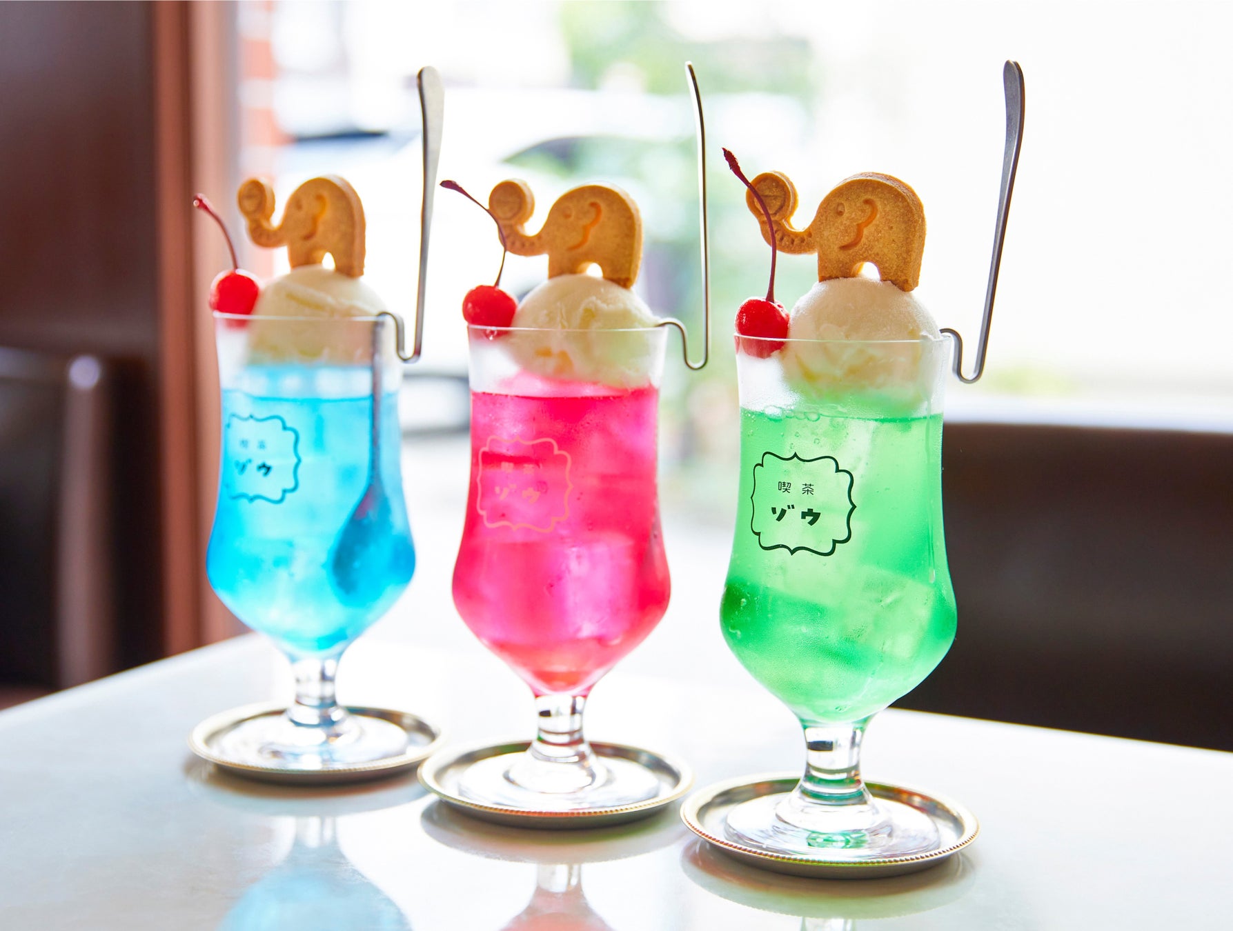 愛知の味噌屋「今井醸造」の今井大輔さんが味噌の魅力を広げたい!と、2015年に愛知で開いたごはんカフェ「ぞうめし屋」の3号店として2019年にオープン。お店は、40年近く続いた喫茶店「ブラジルコーヒーショップ」の内装やレンガの壁もそのまま生かしたレトロムードあふれる作り。お店の一番人気は、ゾウのクッキーがアイスにちょこんとのった色鮮やかなクリームソーダ。アイスが沈まないように氷を敷き詰めてのせるのが、マスター・今井さんのこだわりです。