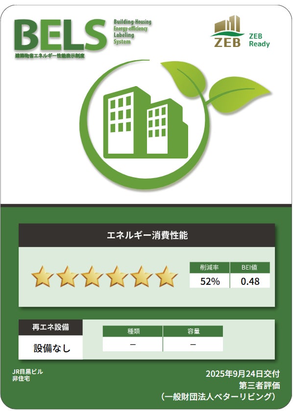 これらの取組み等により、基準一次エネルギー消費量を52%削減し、ZEB Ready認証を取得しています。