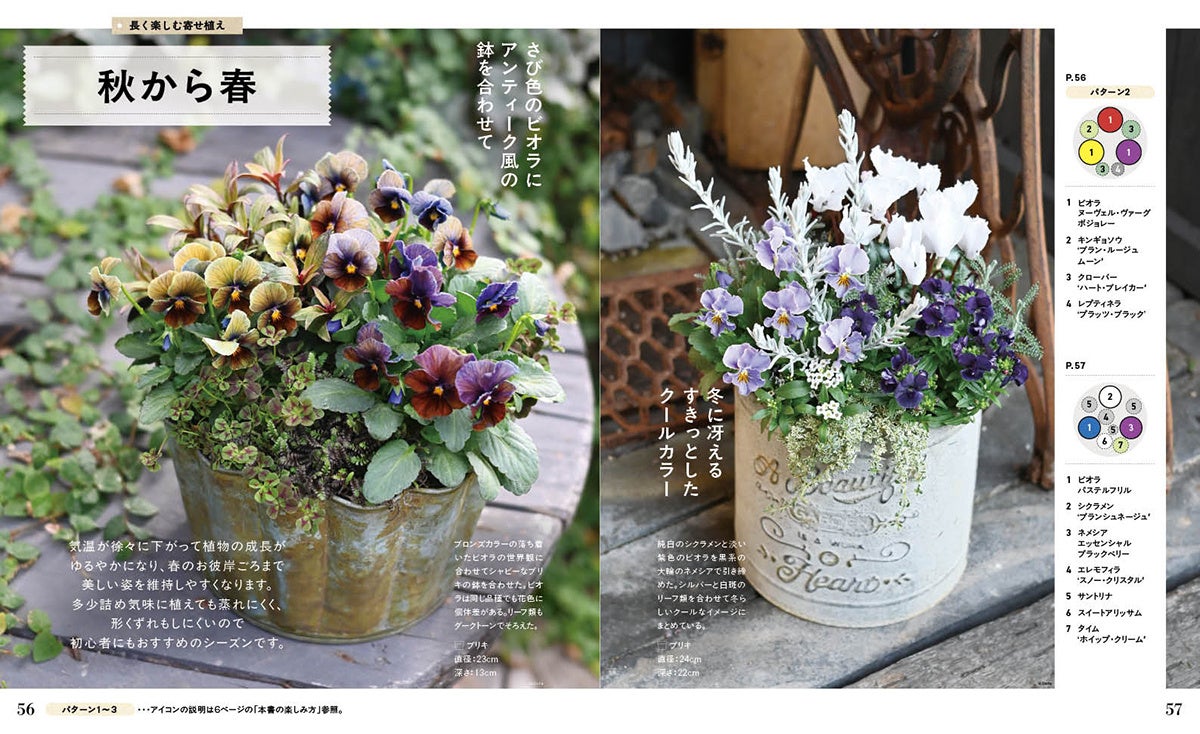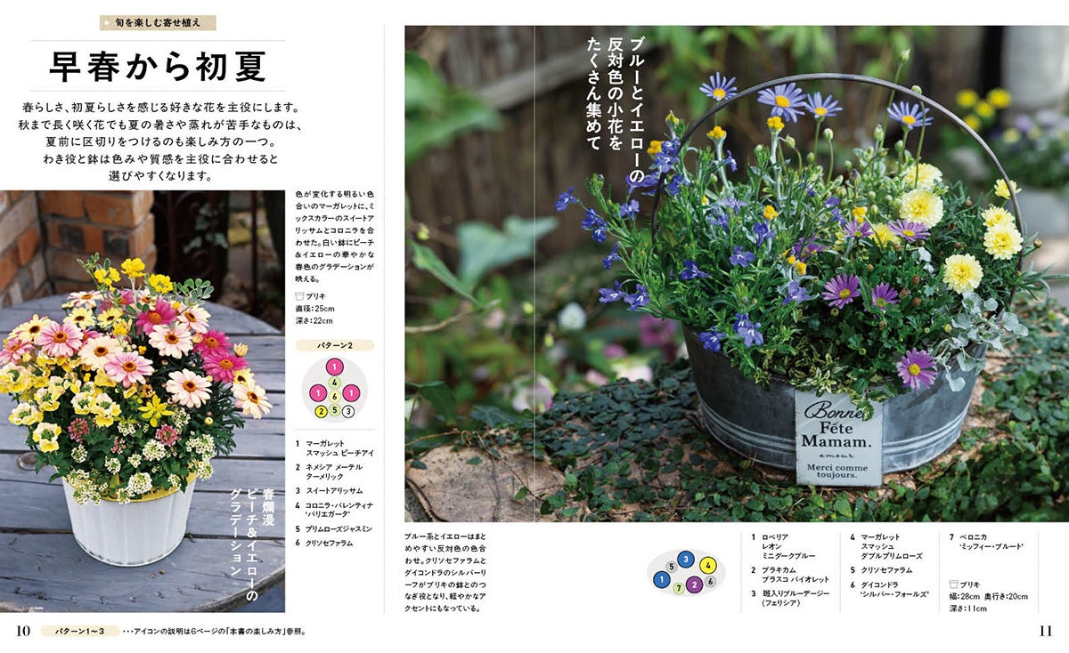 第1章「寄せ植えデザイン集」では、観賞期間が2~4か月程度の「旬を楽しむ寄せ植え」と、4~6か月程度の「長く楽しむ寄せ植え」を、季節ごとに豊富な作例で紹介。寄せ植えのイメージづくりやデザインプラン、植物選びの参考にしてください。