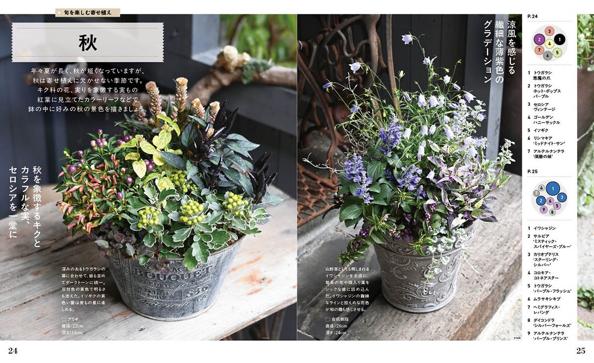 反対色の取り入れ方や株数の多い寄せ植え、秋冬に人気のリースのつくり方、ユニークな鉢の生かし方まで、ポイントを詳しく解説します。