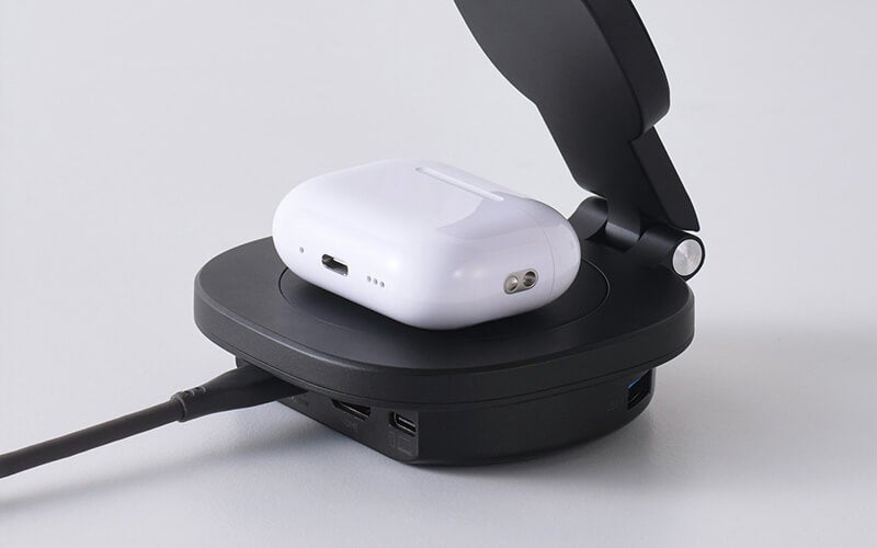 Qi2対応のワイヤレス充電スタンドを備えた4in1ドッキングステーションです。スマートフォンやAirPodsのワイヤレス充電に加え、ノートパソコンや周辺機器の接続も1台にまとめることができます。また、折りたたんでコンパクトに収納できます。