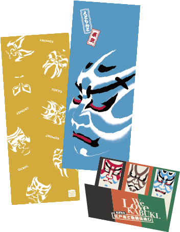 松竹株式会社の監修による、歌舞伎独特の化粧法「隈取」をモチーフとした歌舞伎あんぱん、歌舞伎カクテルの他、オリジナルデザインの手ぬぐい、付箋など、歌舞伎を身近に感じる商品ラインナップです。