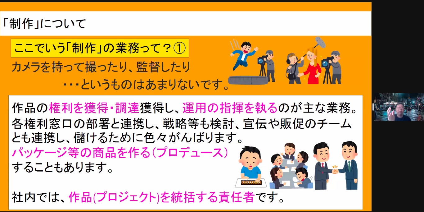 ただ、講座の時間に限りがあるので(笑)、就活生からチャットに書き込まれた質問に答えるコーナーへ。「洋画買い付けに英語のスキルは必要ですか?」については、「話せるほうがもちろん良いです。メールでのやり取りや台本も読めますし。ただ、僕は全く喋れないし、読めません(笑)。過去に会食で喋れないから黙っていたら、寡黙な性格かと思われました」と実体験を告白。「やりがいは何ですか?」と問われると、「まだ海外で企画や試写段階のものを観て、自分だったらこんな展開をしたい、ヒットするんじゃないかと思ったプランにチャレンジできること。もちろん失敗や大変なこともありますけど、映画好きなら楽しいです」と真っ直ぐな想いを伝えてくれました。