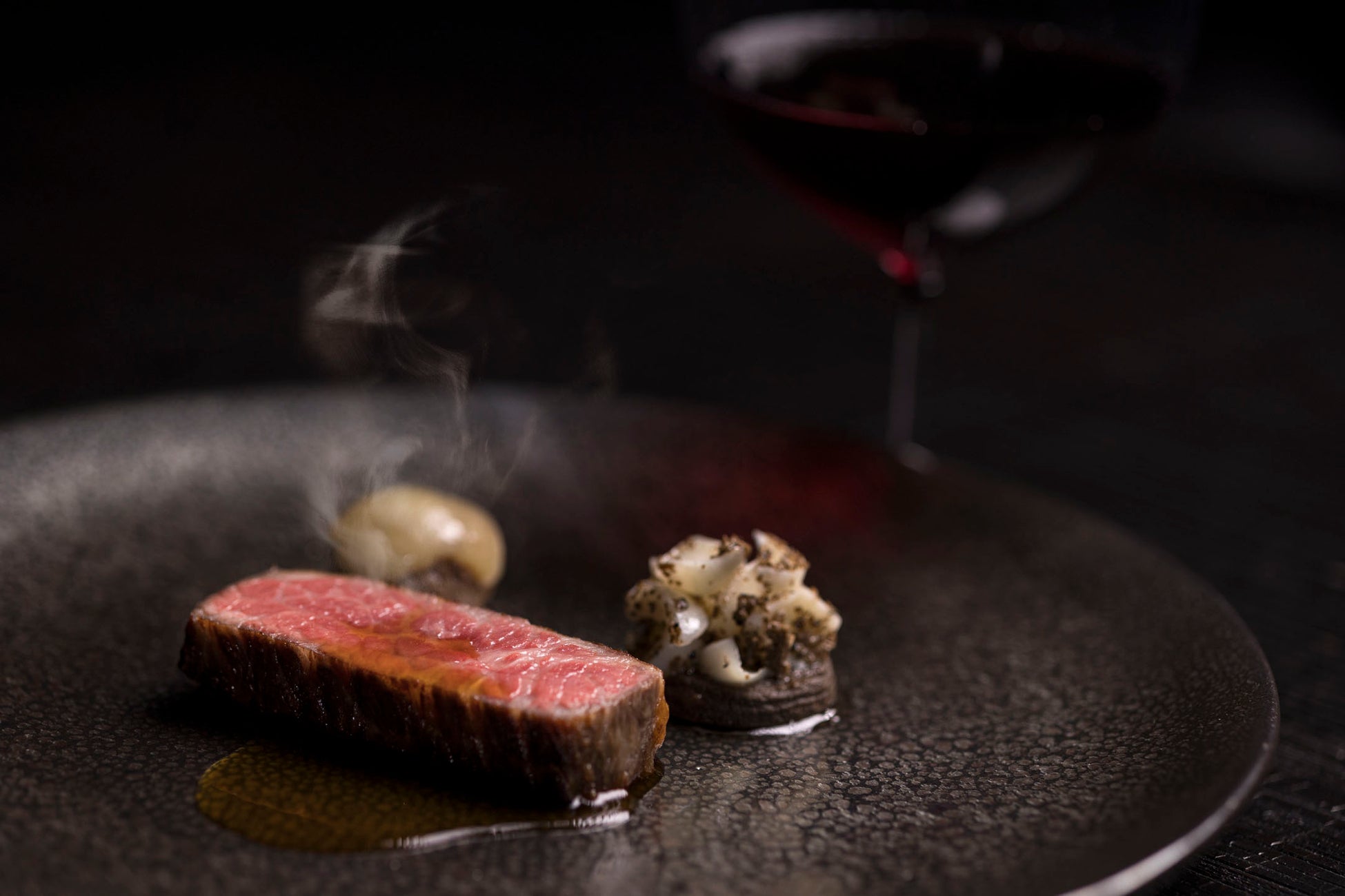 メインディッシュの「牛」には、滋賀の郷土料理「鮒ずし」の芳醇な風味を纏わせた、独創的なハンバーグを添えます。飯(*3)に漬け込んだ牛肉で作るハンバーグは、一口サイズながら鮒ずしらしい酸味と芳醇な旨味をしっかりと感じさせる、存在感のある付け合わせです。丁寧に蒸し上げたゆり根とトリュフピュレのソースが、牛本来の旨味をさらに際立たせます。滋賀の伝統的な味わいと新しい食体験が融合した一品です。
