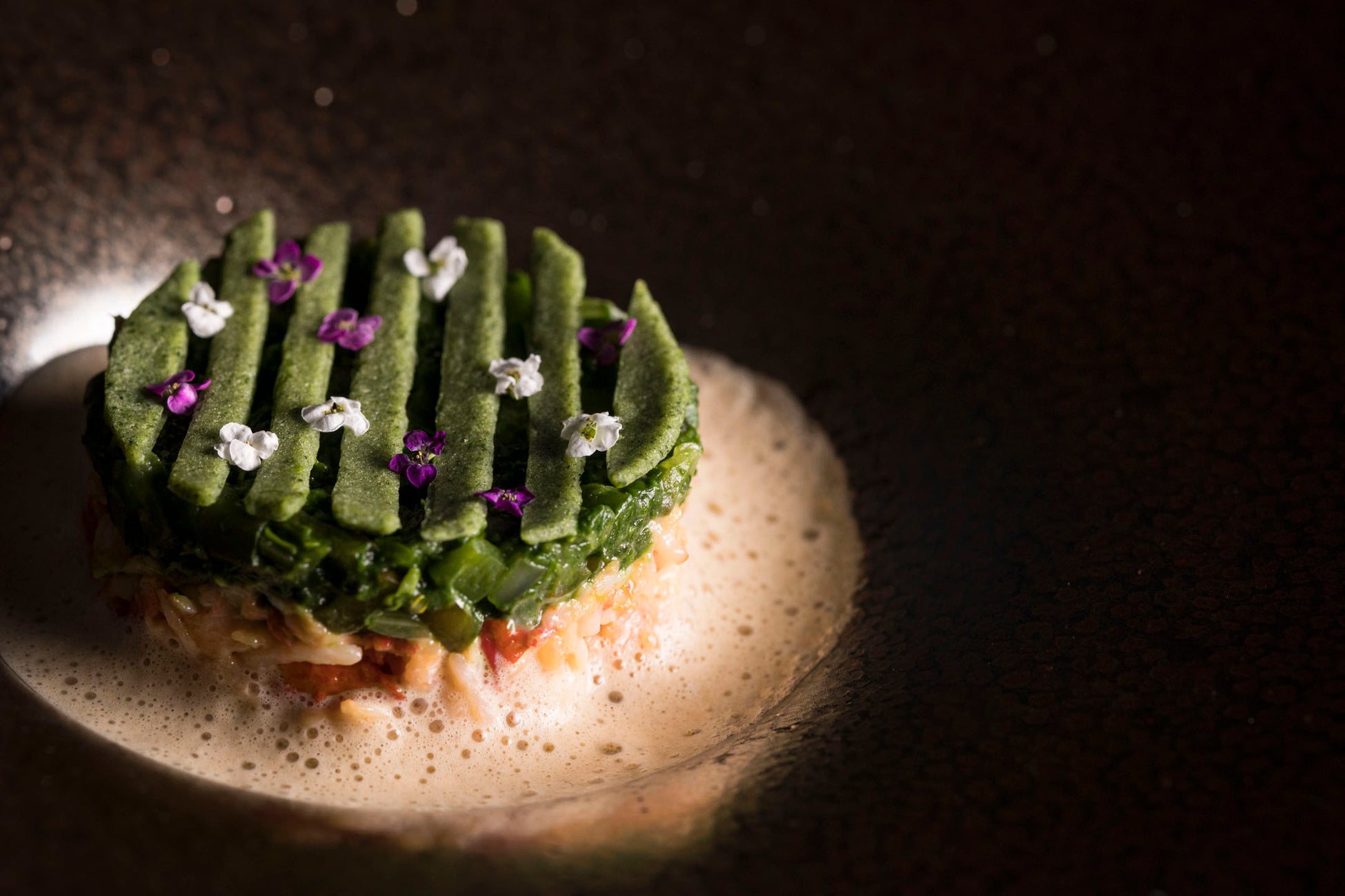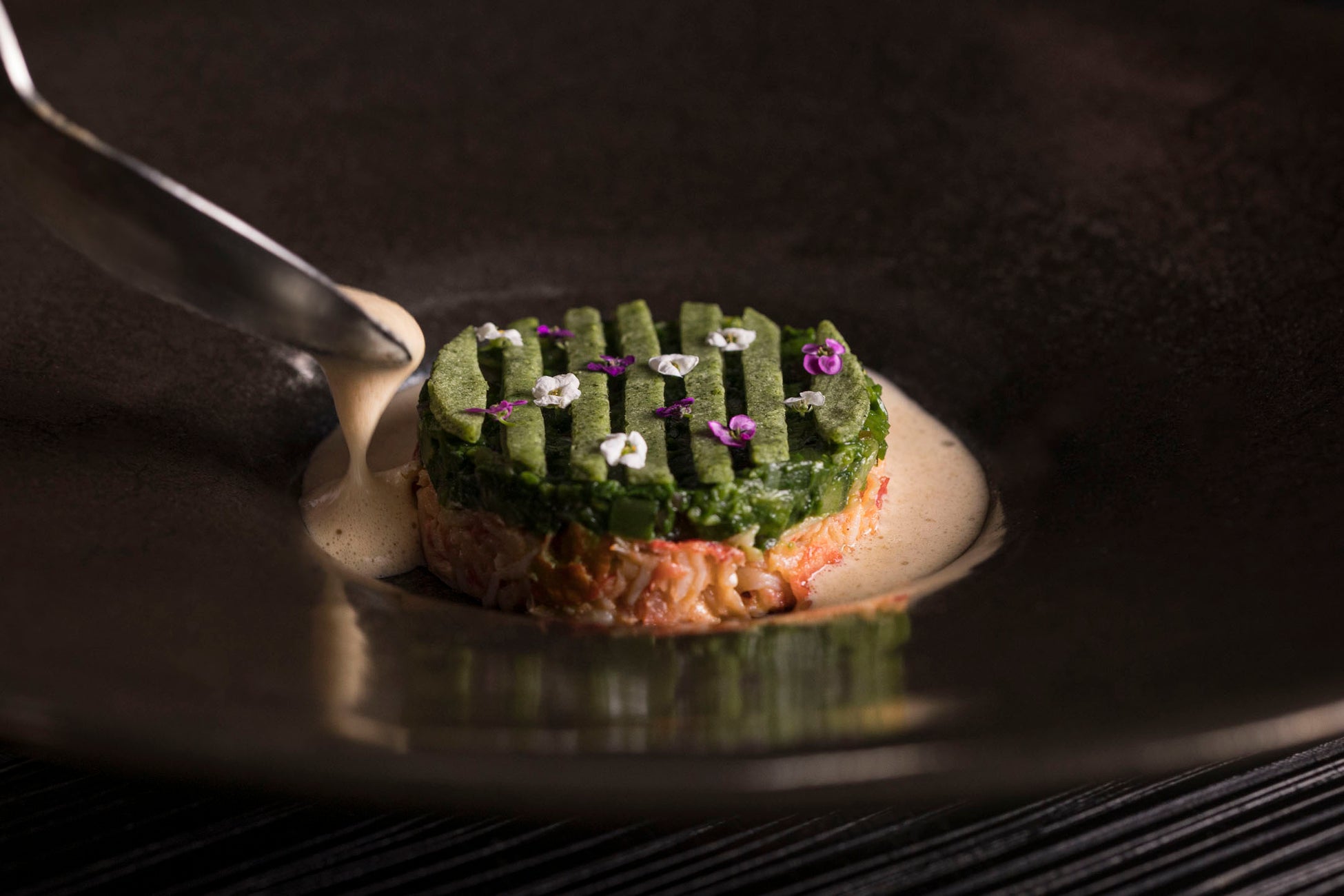 蟹の濃厚な旨味を堪能できる贅沢な一皿です。長野の伝統漬物「やたら」をモチーフに、春菊などの葉野菜を使ってコンディマン(*2)に仕立てました。漬物のようなシャキッとした食感が、柔らかく繊細な蟹の身を一層引き立てます。蟹のソースに加えるのは、小さな蟹を丸ごと潰し、塩や唐辛子とともに熟成させた佐賀の塩辛「がん漬け」です。蟹の濃厚な旨味を引き出し、さらに深みのある味わいへと導きます。