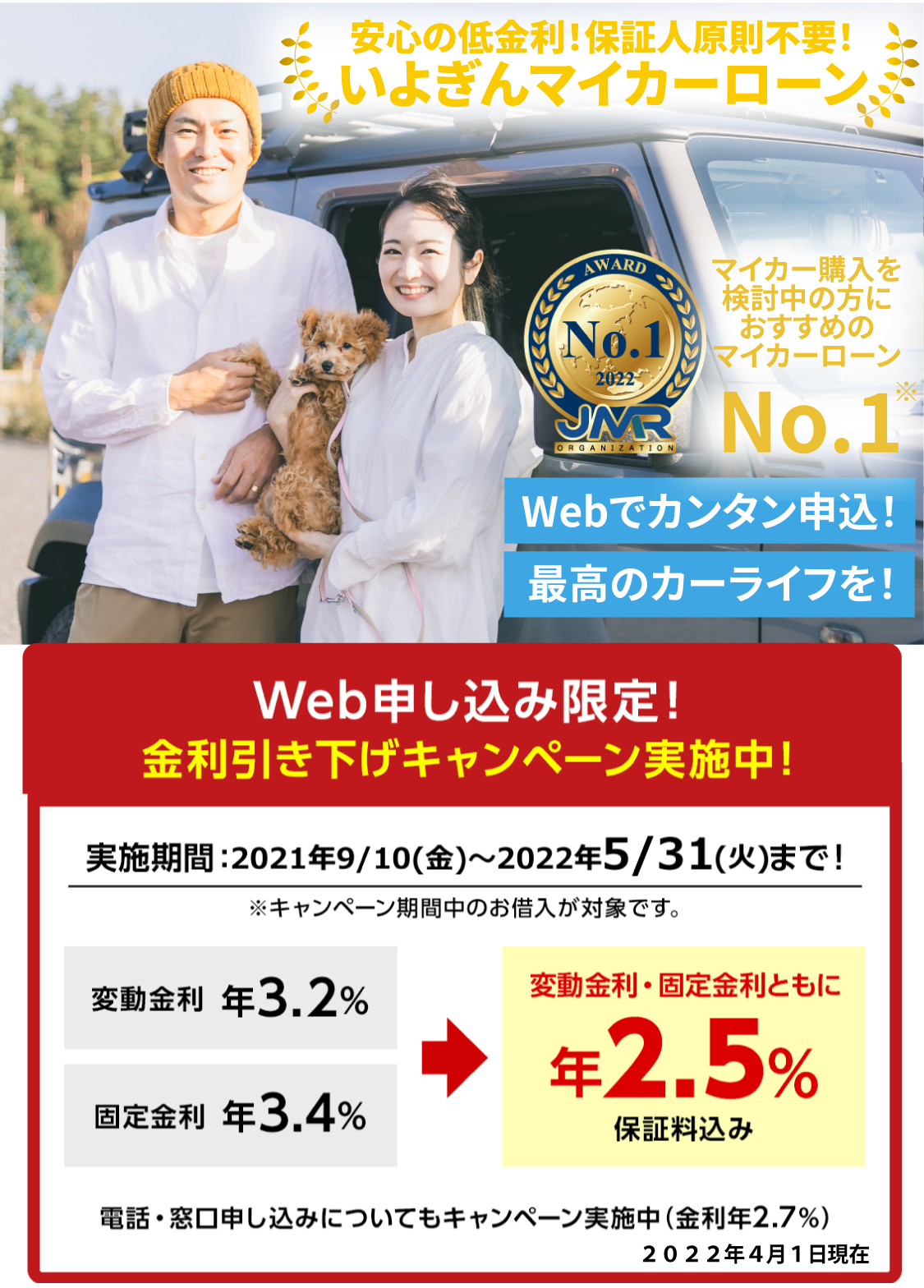 日本マーケティングリサーチ機構が、2022年3月に第一地方銀行 消費者ローン貸出金残高においてインターネット調査を実施した結果、伊予銀行の「マイカーローン」が『マイカー購入を検討中の方におすすめのマイカーローン No.1』、「教育ローン」が『子どもの進学時におすすめの教育ローン No.1』を獲得。